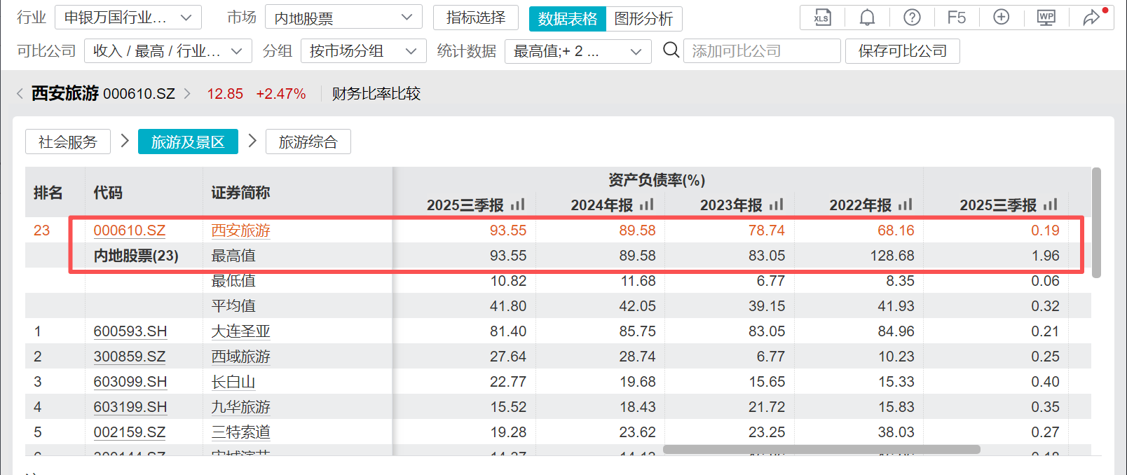 事实上,近年来西安旅游的偿债压力正明显上升。2022年、2023年、2024年,该公司资产负债率分别为68.16%、78.74%、89.58%。2025年前三季度,其资产负债率进一步上升至93.55%。值得注意的是,Wind数据显示,这一数值在A股旅游及景区行业上市公司中高居榜首,较行业平均值 41.80% 高出超50个百分点。