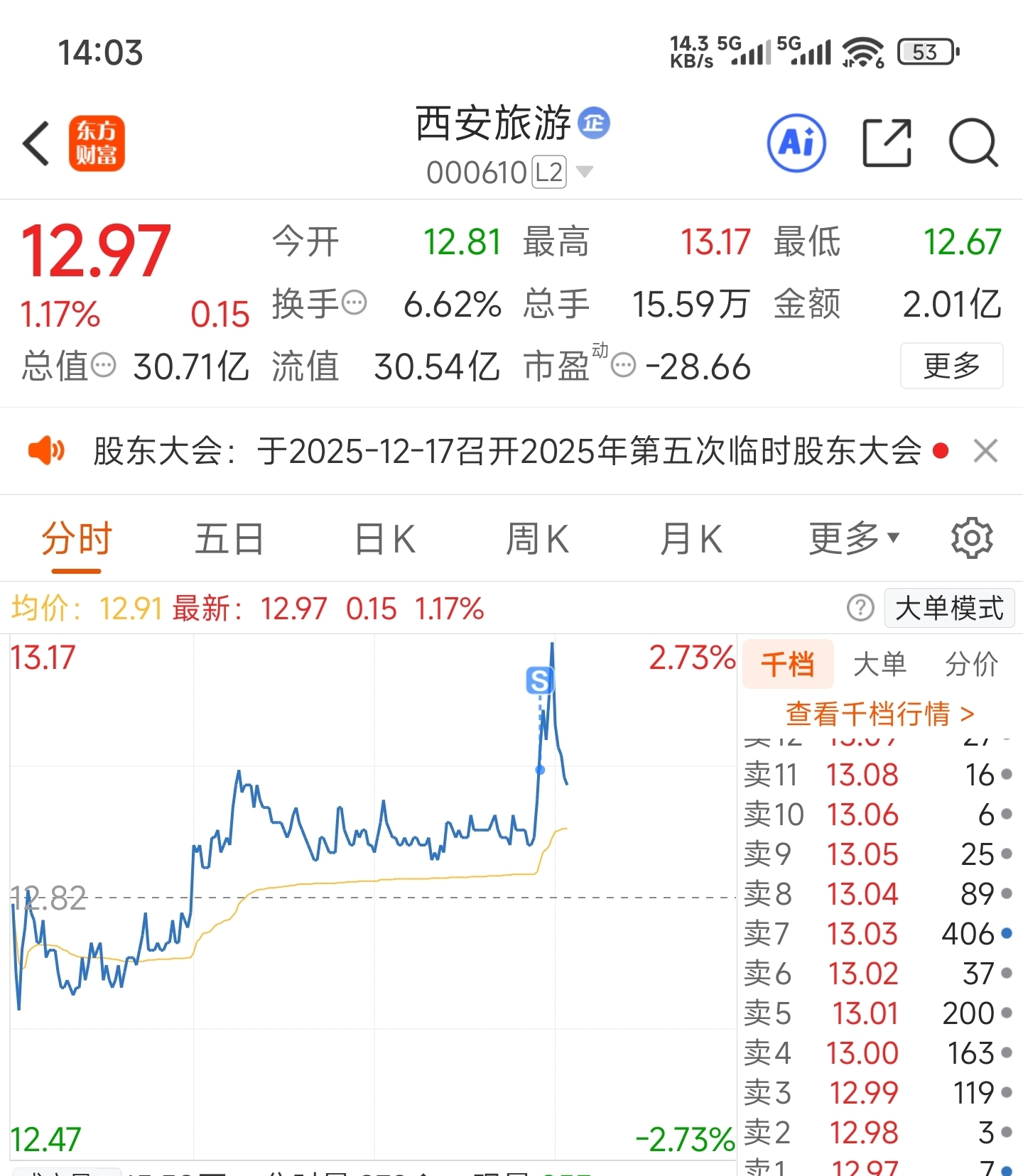 $西安旅游(SZ000610)$ 搞我心态,迟迟不上13,结果挂的12.99成交了。