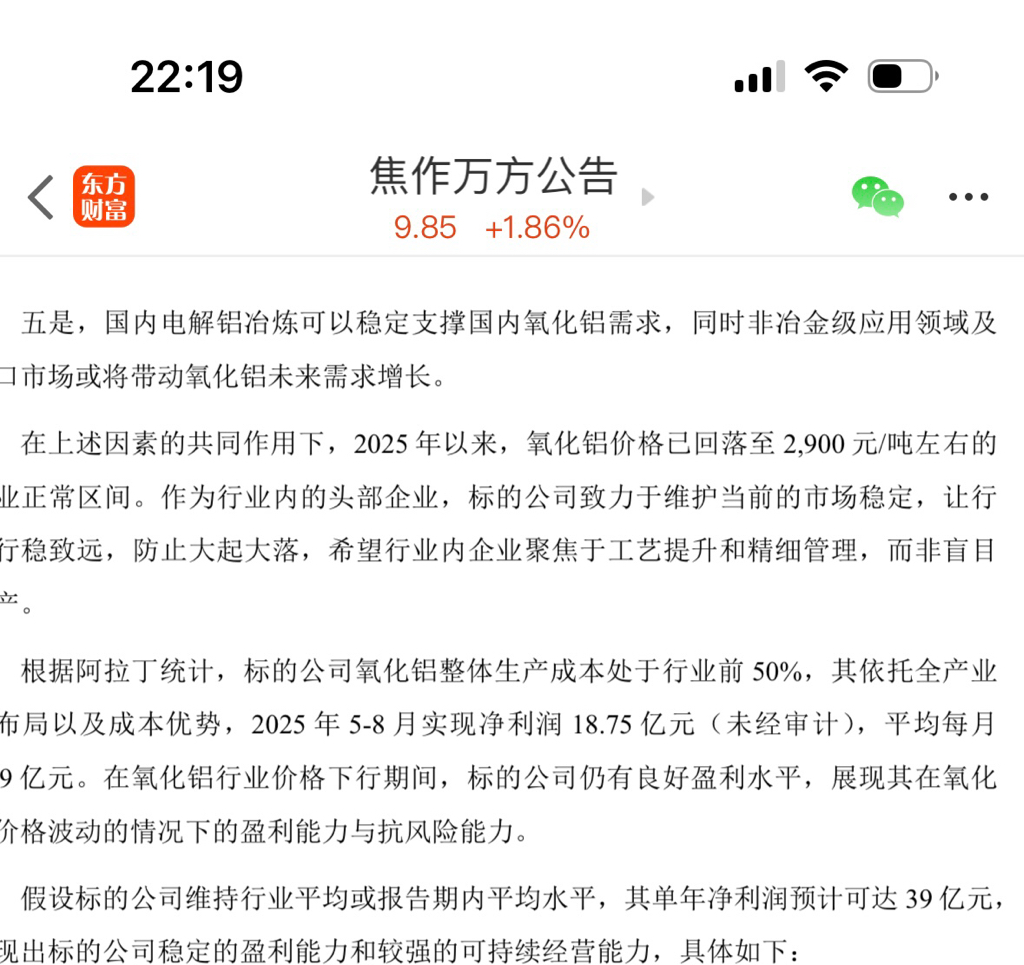 $焦作万方(SZ000612)$ 按5-8月氧化铝价格每个月盈利4.7亿,一年净利56亿