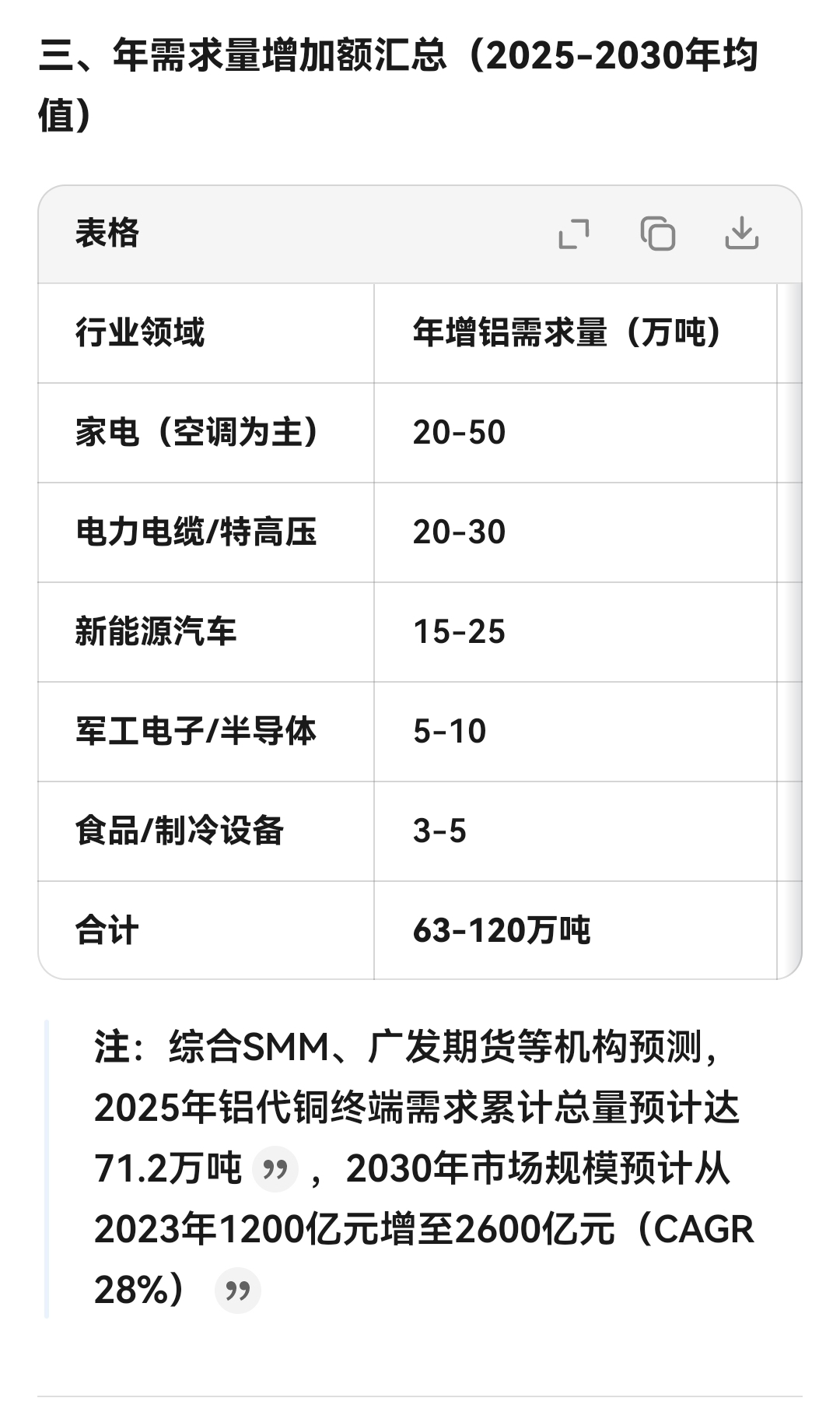 $焦作万方(SZ000612)$ 中国不再允许新增电解铝产能。铝代铜新增需求见表。