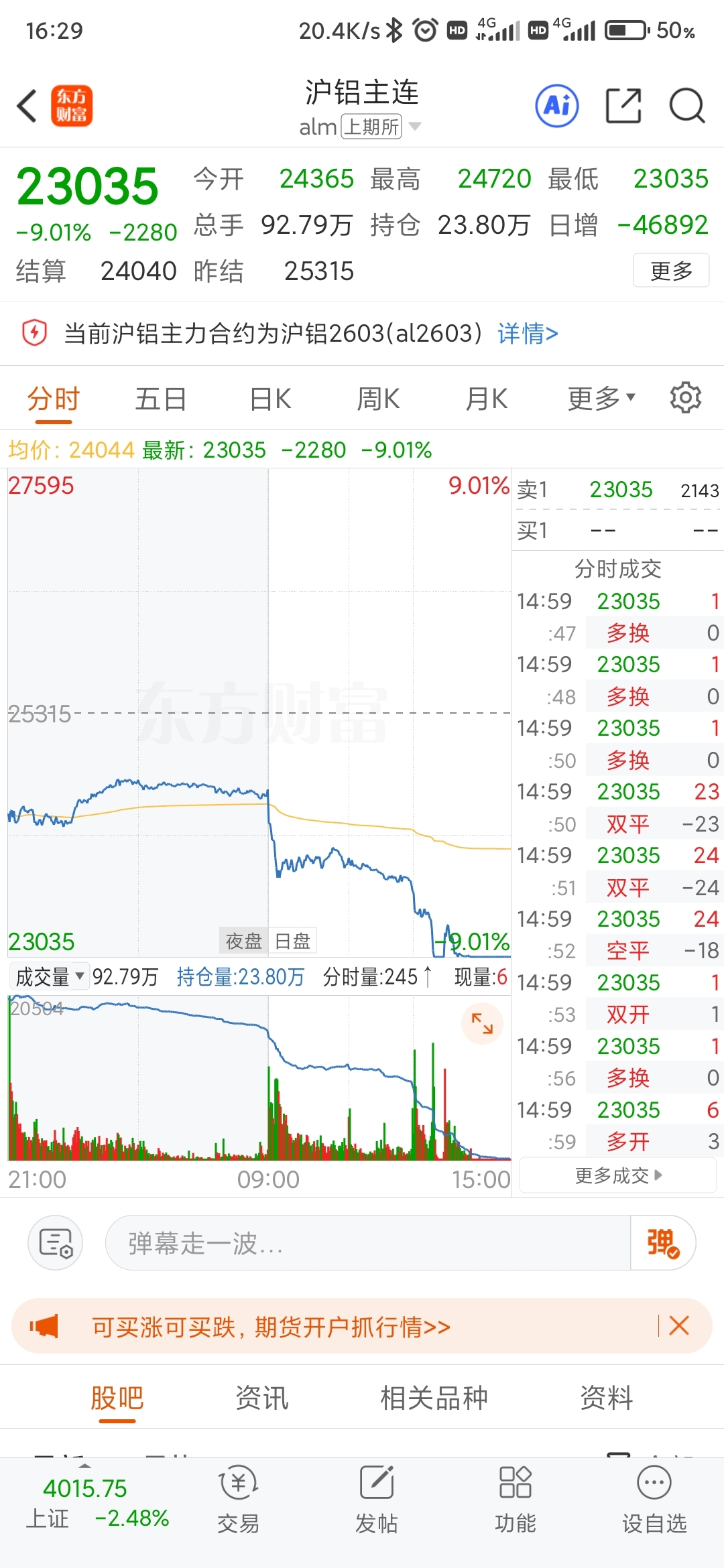 $焦作万方(SZ000612)$ 不要慌,你敢抄他底,我抄你本金,明天收盘最多还能跌5.18%却12.16元,不然出货名就暴露出来了,铝期货继续下跌,加上尾盘跌破开盘价,表明还未止跌,还有人问我可以抄底不,我都是说不能抄,现在大盘也大跌了,宁愿空仓不要亏本金,黄金也未止跌,所以有色还能跌二天才能止跌