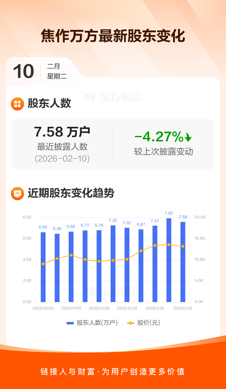 焦作万方:截至2月10日最新股东户数7.58万户,较上期减少4.27%