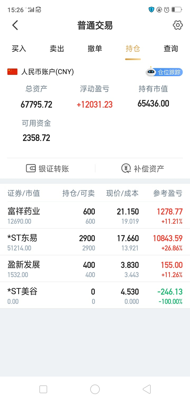 $*ST美谷(SZ000615)$ 还好周5买的少亏了快10个点,今天居然跑出来了。周5买的富祥和盈新还是吃了肉,减去美谷亏的还赚了点,呵呵。真不能全仓一只股票,不然就只有躺平了。