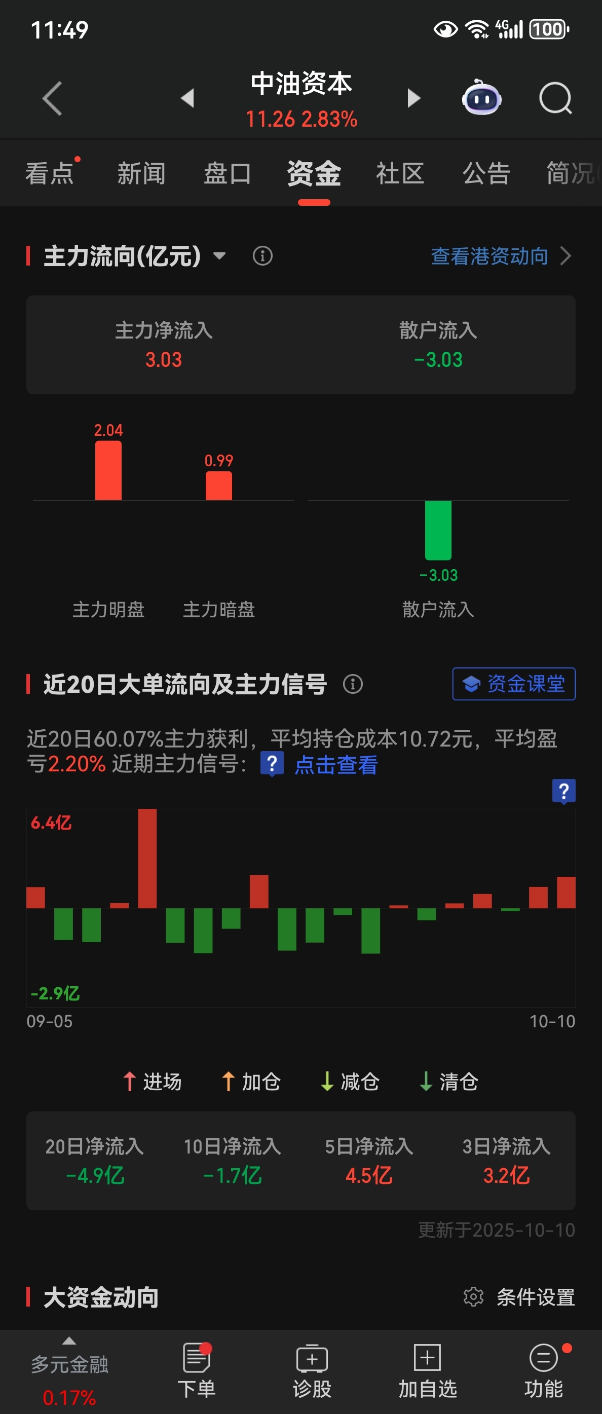 $中油资本(SZ000617)$ 虽然今天主力进了三个多亿,这货过不了11.55-11.85还得调整下来,预测小反弹结束