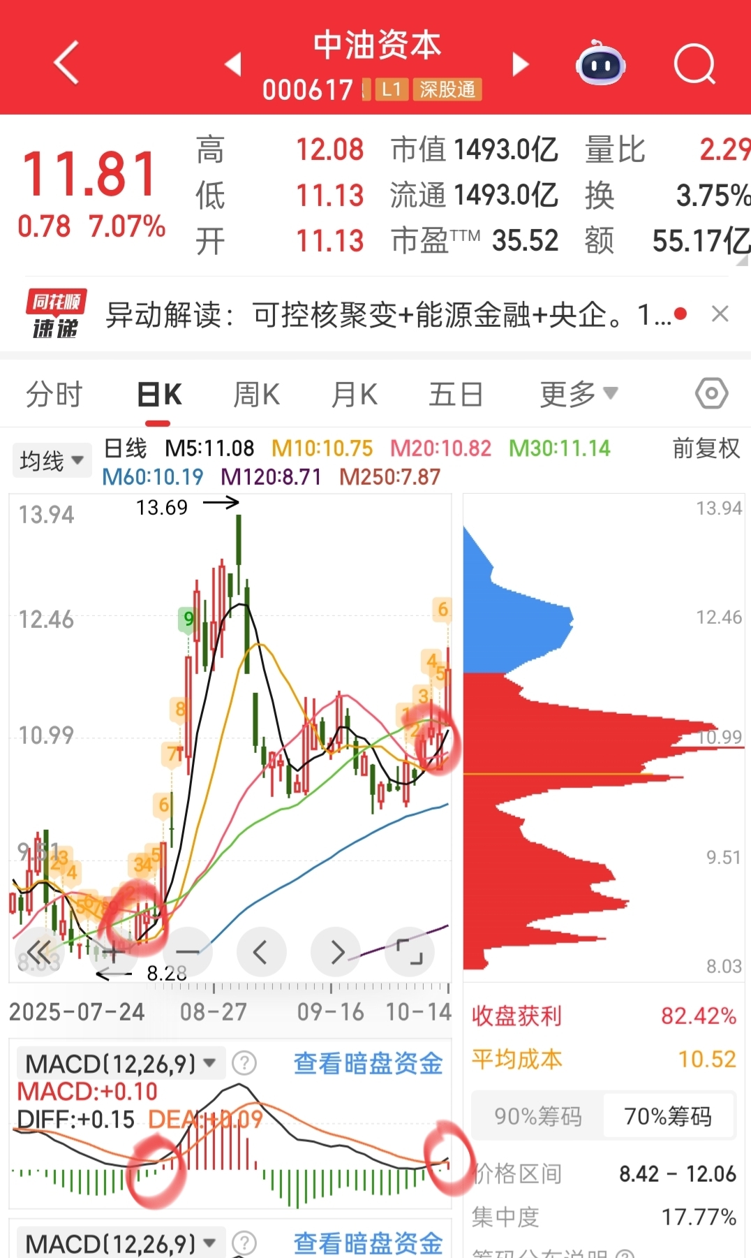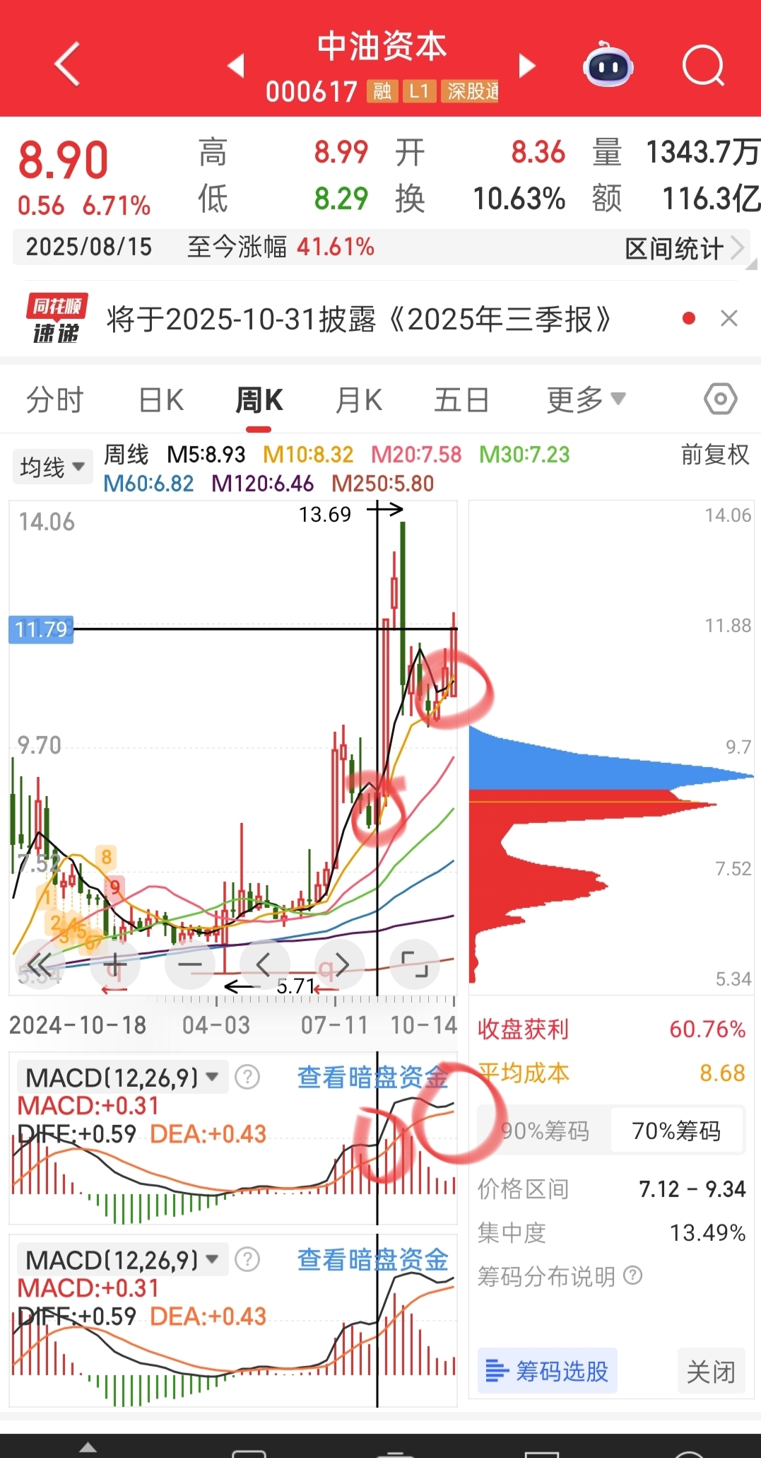 最近很多宝宝在学习技术知识了,实战再来一个,周线和日线的技术形态,能不能成我不知