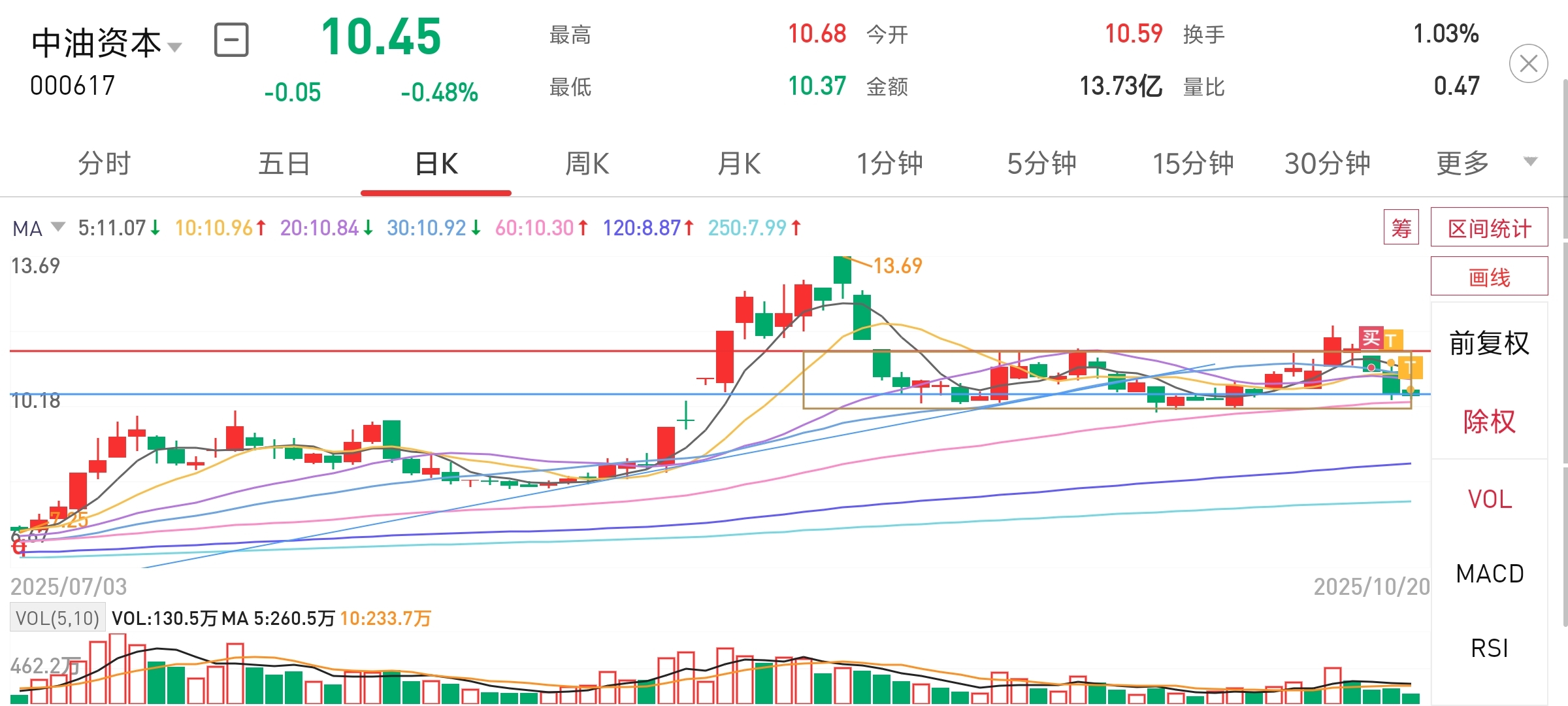 $中油资本(SZ000617)$ 目前日k箱体震荡,支撑位10.2,压力位11.5。明天收盘破支撑走,今天做了t,没亏。连跌4天,今日未创新低。30,60分钟一个底背离,明天看涨,第一目标位10.7。不建议做t了,可能t飞。