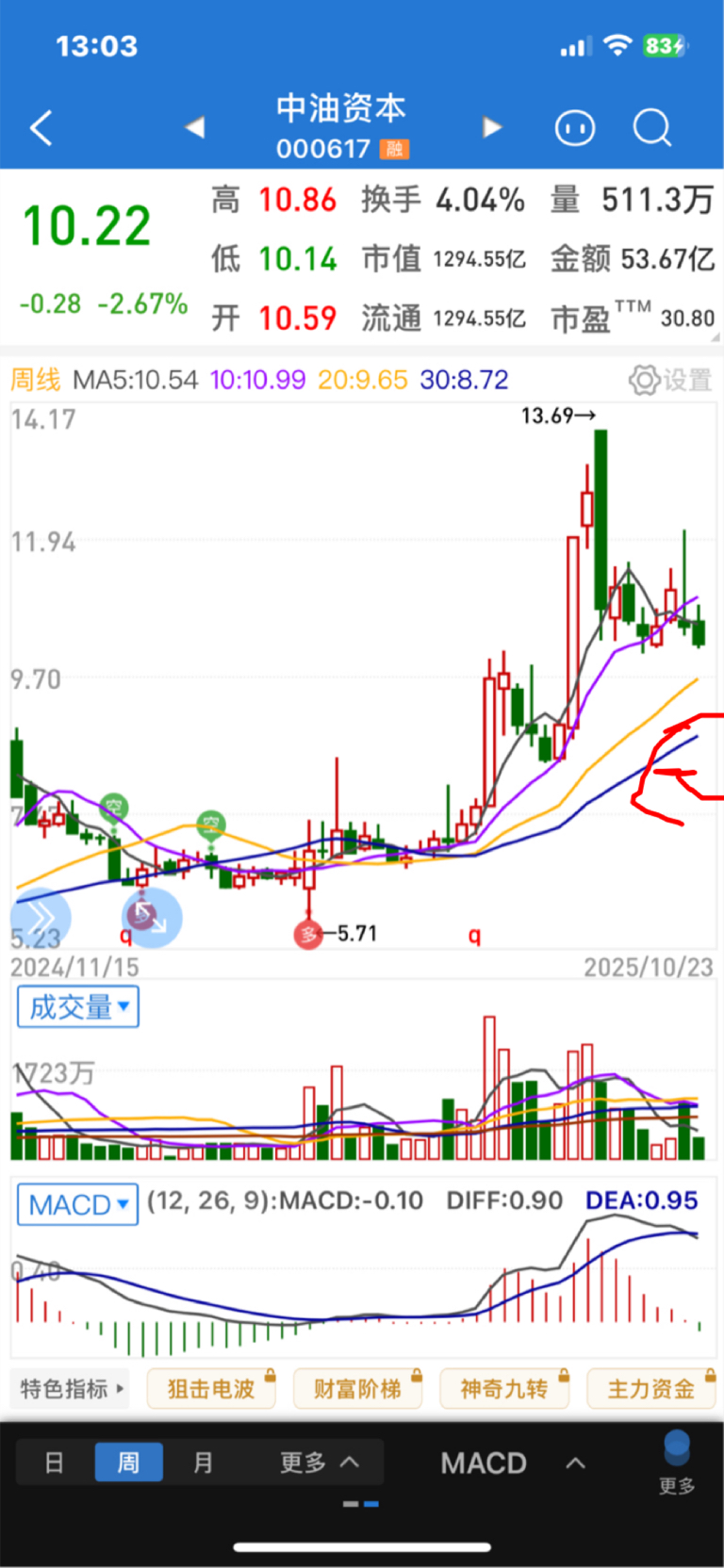$中油资本(SZ000617)$ 有底吗?错,是有低,更低,如图30周线不一定是底,是低,已经步入下降通道,银行石油藐视可以咬一口!