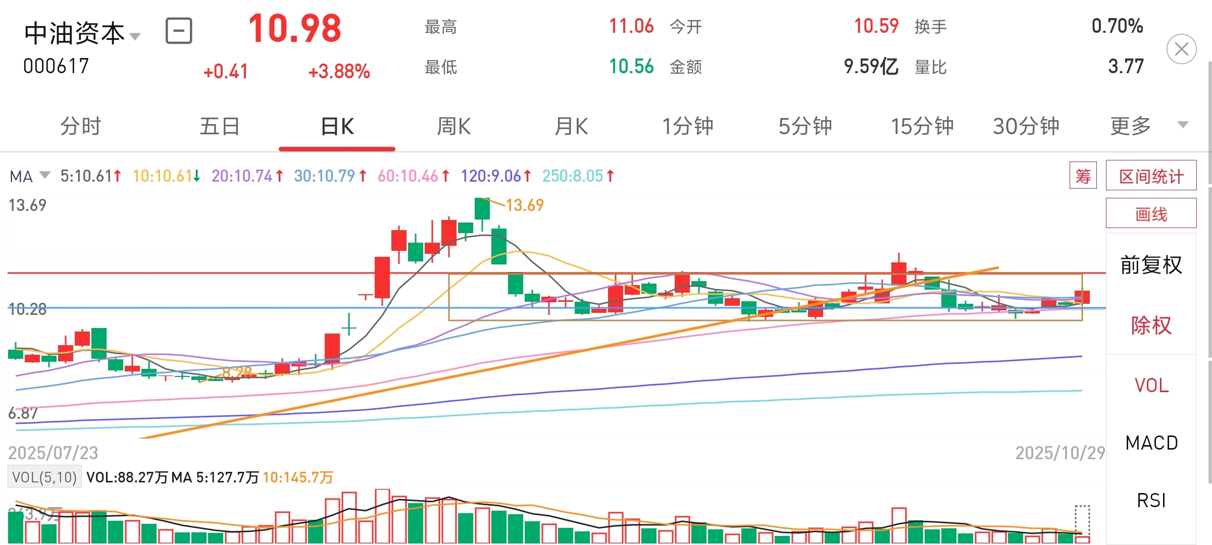 $中油资本(SZ000617)$ 图还是这个图,它今天第一关11.3。大盘过4000的话应该不是问题,过完11.3减点仓位,月底了资金都谨慎,11月份等低点再加回来。感谢中油,回本略有盈余,感谢a公子。