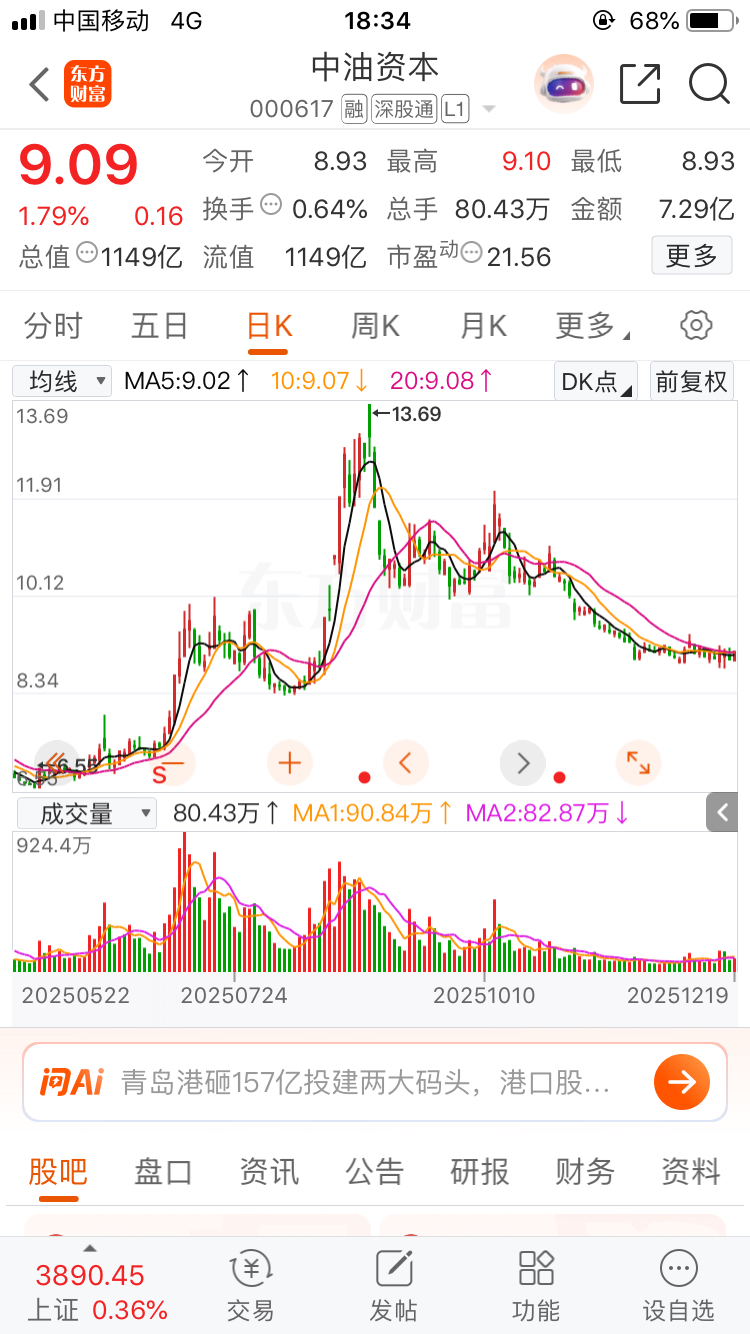 $中油资本(SZ000617)$ 典型的指标股,"中油资本"这公司名称喊得不太顺口,建议改名为"中石油资",大家无需研究此票,指标股最大的特点就是跟随指数,买它等于买指数,大盘指数涨,你就赚,反之就亏。大盘股,指标股,涨多了卖,跌多了买,以时间换空间。