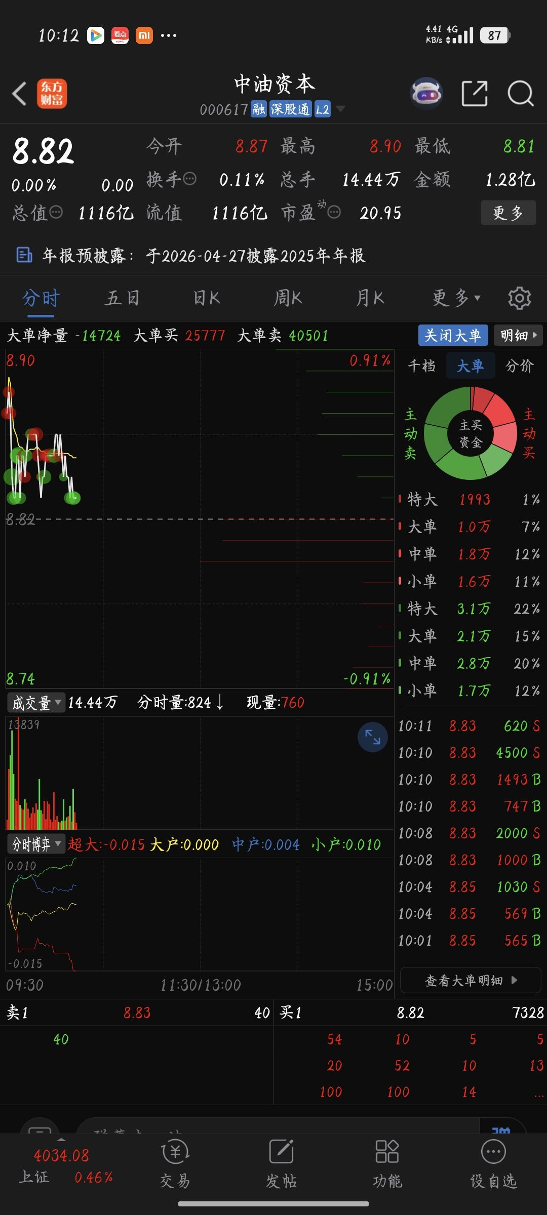 $中油资本(SZ000617)$ 看看这大单流出 又废了,早上开盘卖出没啥毛病了,说不好下午得绿
