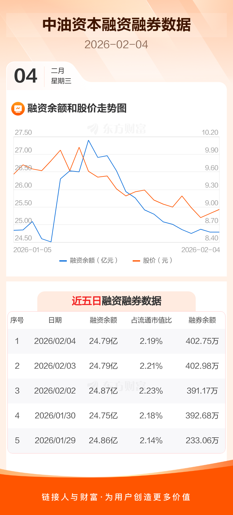 交易所最新数据显示,中油资本于2026年2月4日获融资买入5058.14万元,融资偿还5028.10万元,当日融资净买入30.04万元。目前,该股融资余额24.79亿,占流通市值比例为2.19%。