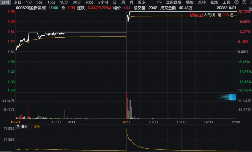 值得注意的是,盈新发展本周一、周二股价连续涨停,截至10月21日,该股报收于1.98元/股,市值为116亿元。