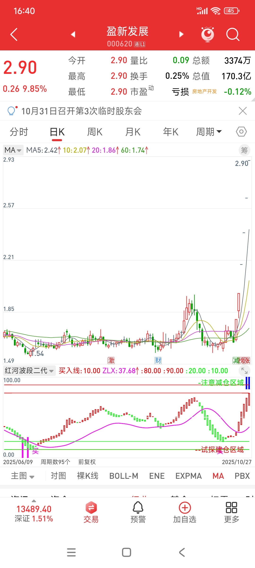 $盈新发展(SZ000620)$ 底部出现买字以后叠加绿柱转红柱做确认,然后价格一路上扬至今,那就没什么好说的了,毕竟红柱不停,上涨不止,红柱拉长,加速不止,继续冲