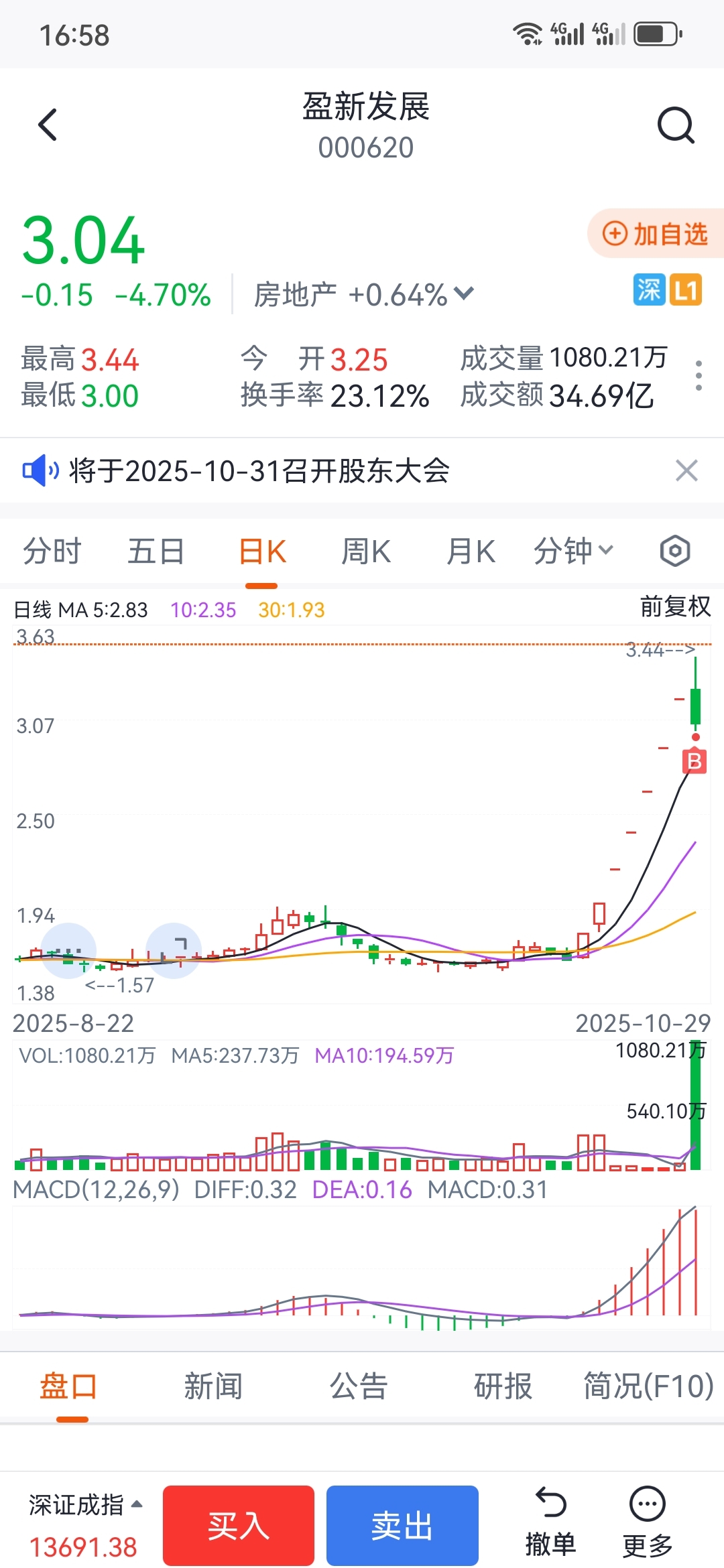 $盈新发展(SZ000620)$  看来是买高了,哎,