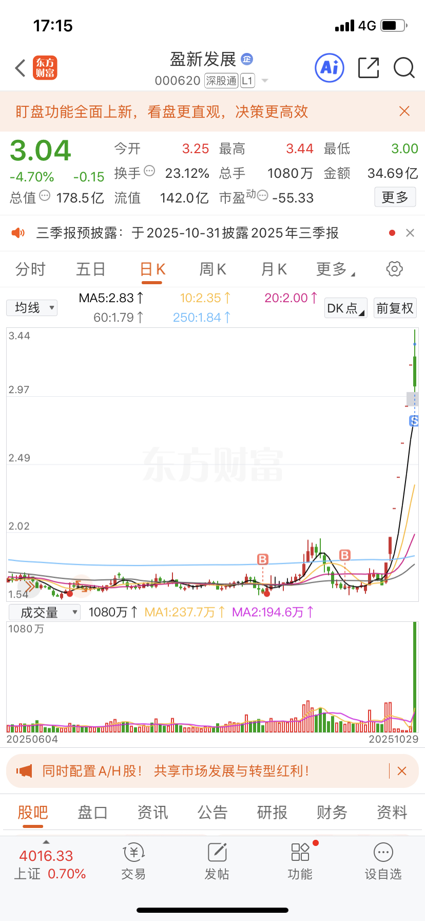 $盈新发展(SZ000620)$ 高位放量,先跑了,等机会接回