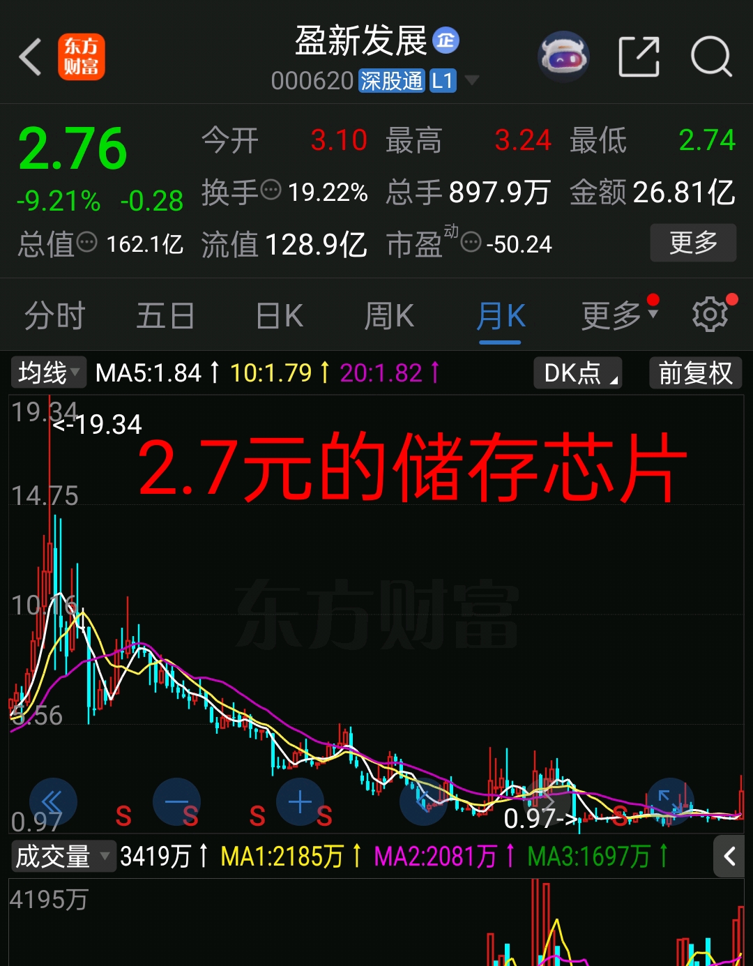 2.7元的储存芯片没见过,看江波龙,德明利,香农芯创,储存芯片,300元一股,都500到1000亿市值。几个都买过,半路下车,错过翻倍。牛市中,2块的储存芯片,要走两三波。一个月后6元见。万通发展8月10号收购芯片也翻三倍。走三波