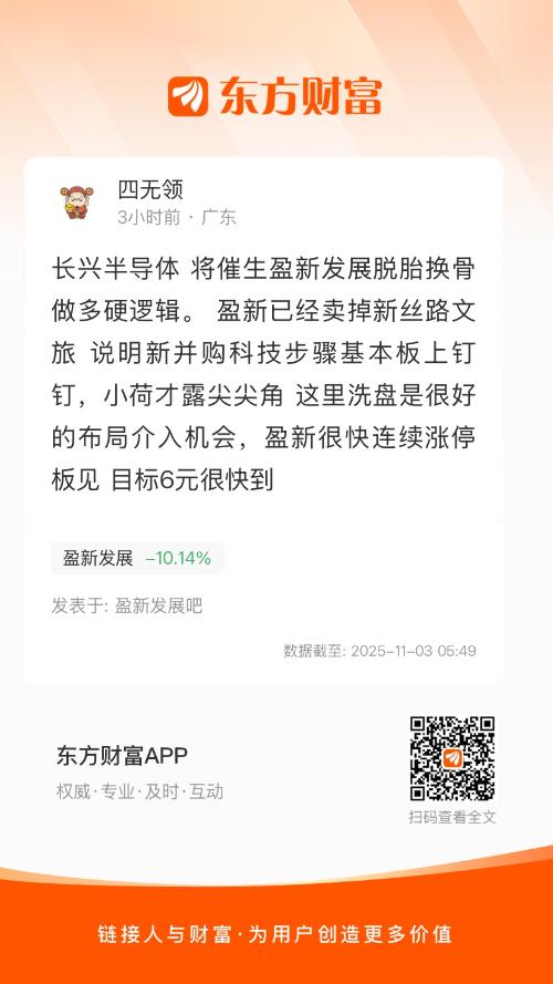 长兴半导体 将催生盈新发展脱胎换骨 做多硬逻辑。 盈新已经卖掉新丝路文旅 说明新并购科技步骤基本板上钉钉,小荷才露尖尖角 这里洗盘是很好的布局介入机会,盈新很快连续涨停板见 目标6元很快到