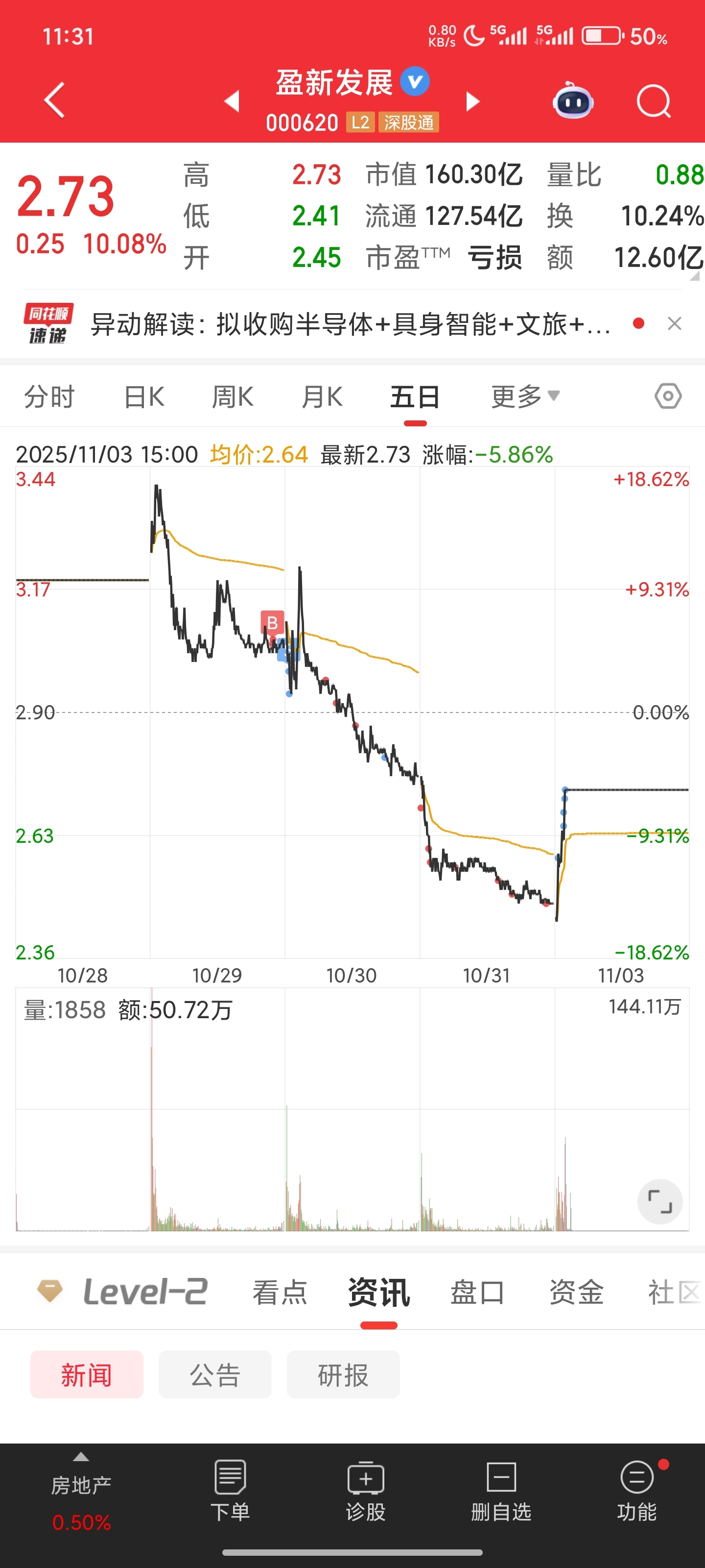 $盈新发展(SZ000620)$ 不枉我昨天买了一天啊,尾盘恐慌了,跌停挂单,结果没卖出去,因祸得福了。