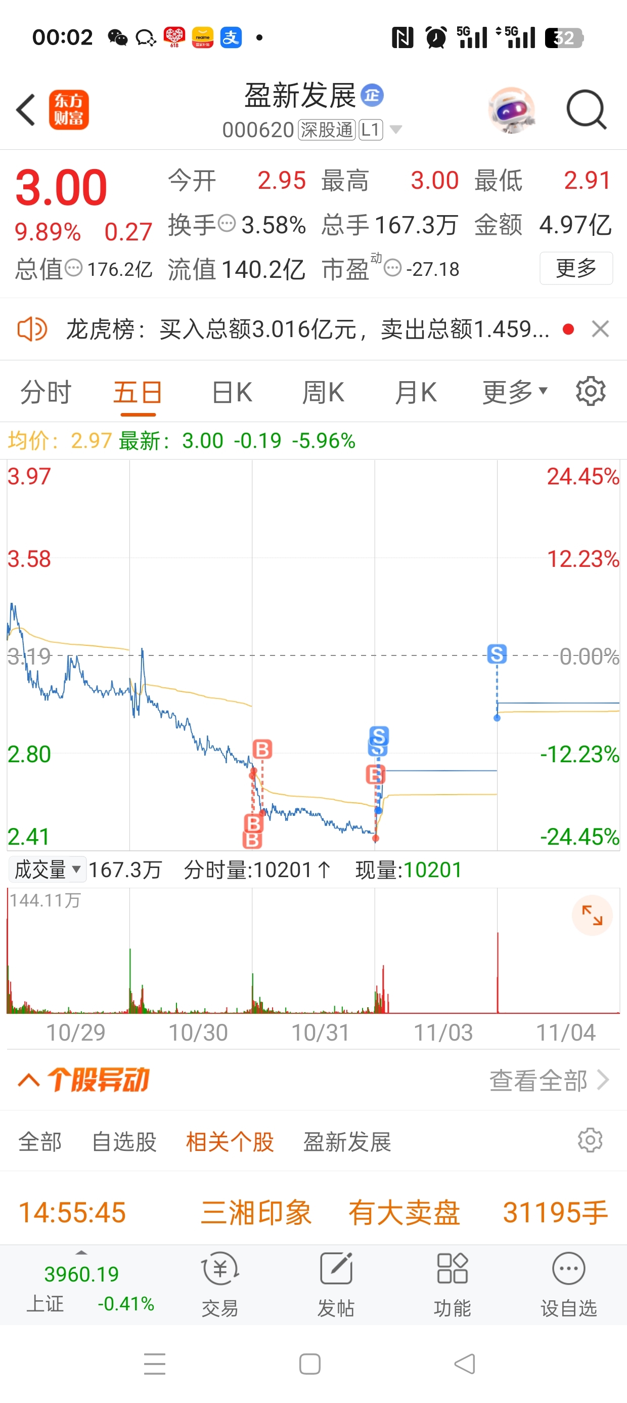 $盈新发展(SZ000620)$ 妈的,下跌的那天加了两次仓,上涨了两天不断的卖飞,跌了能拿住,涨了拿不住,难道真是散户通病?不行,这得改!向上涨的要加仓,要加仓,向上加仓!!!