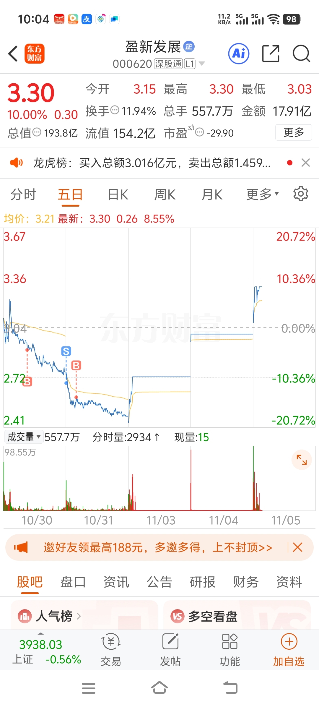 $盈新发展(SZ000620)$ 一睡醒又下班