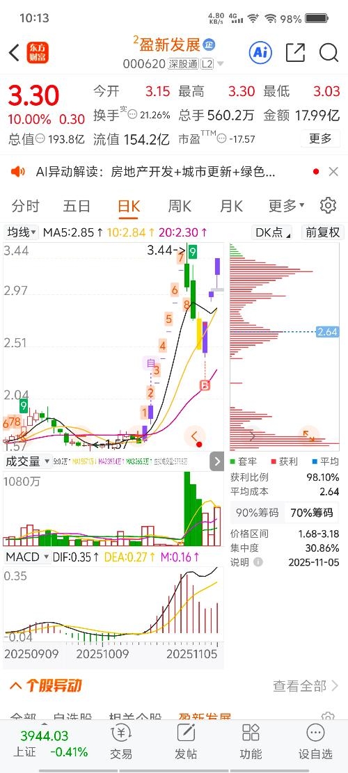 盈新发展喜获3连板,恭喜买入的铁粉,明天能不能4连板?股市没有眼泪!风里雨里大雕