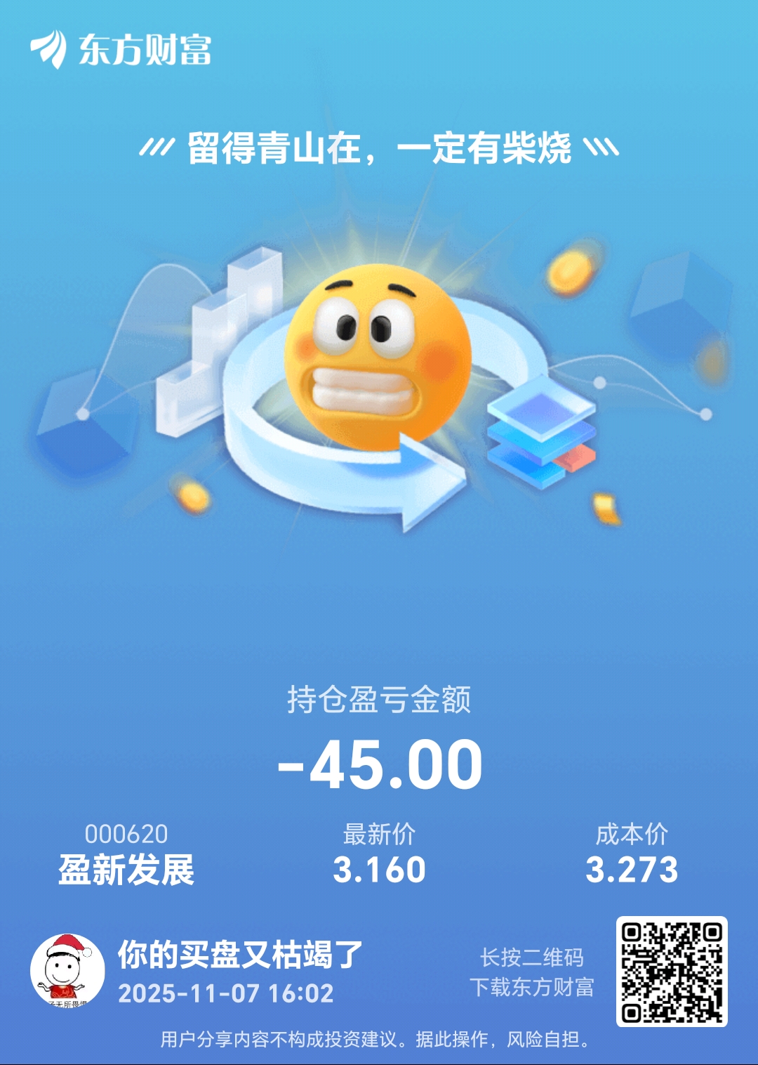 $盈新发展(SZ000620)$ 被套了,周一割肉止损