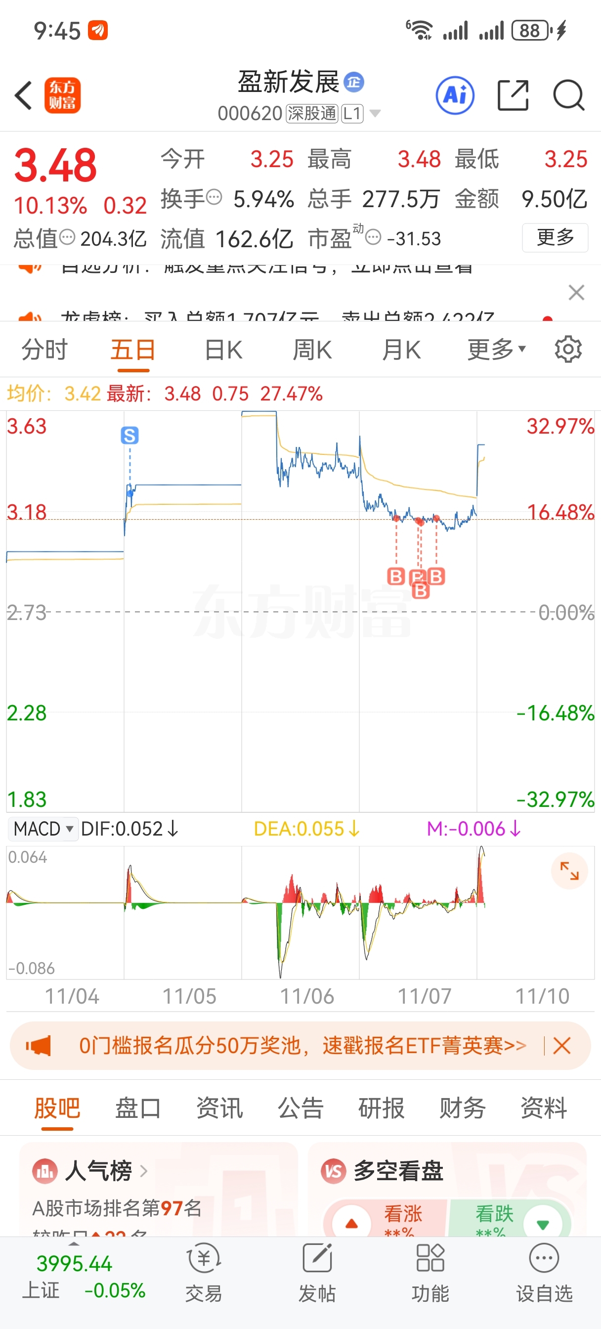 $盈新发展(SZ000620)$ ,难得发个帖子,一群新号说我被套,无脑唱多,真的不想计较,周五你们被套我都不可能被套,盈新发展,路化科技,橙星股份,是我今年研究的低价股中的优秀选手,不管是股性还是目前的大盘背景!特别是迎新发展,一直占我大部分仓位,之所以看好他,肯定是有很多逻辑,以及背后的博弈,最重要的事,他有其他势力的参与。上百亿的价值在里面,你们允许,有的人也不会允许他下杀!