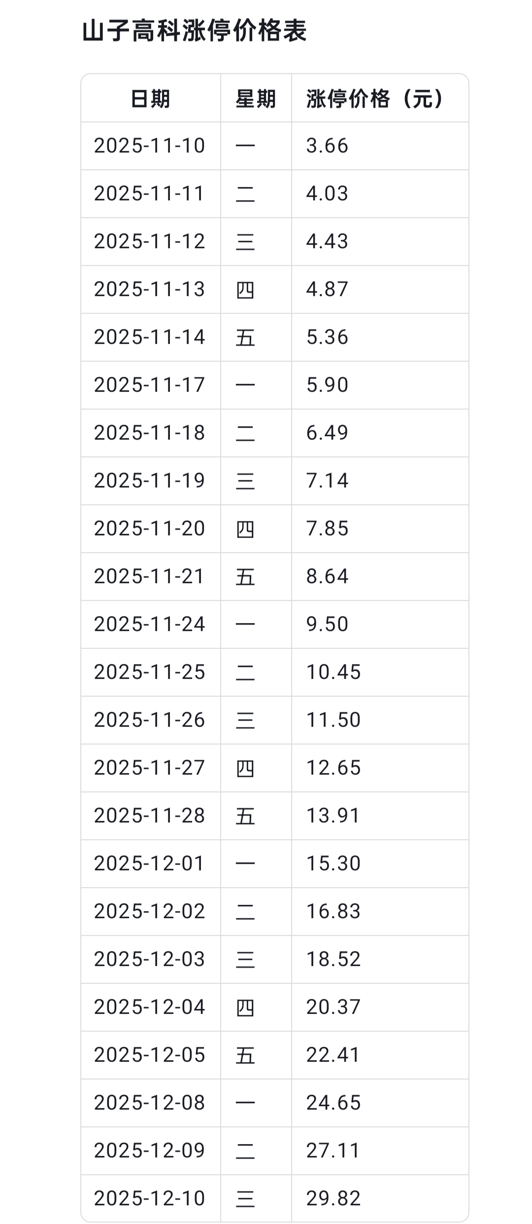 鄙人不才,全仓买入,杠杆拉满。这是重新编辑的山子高科涨停价格表