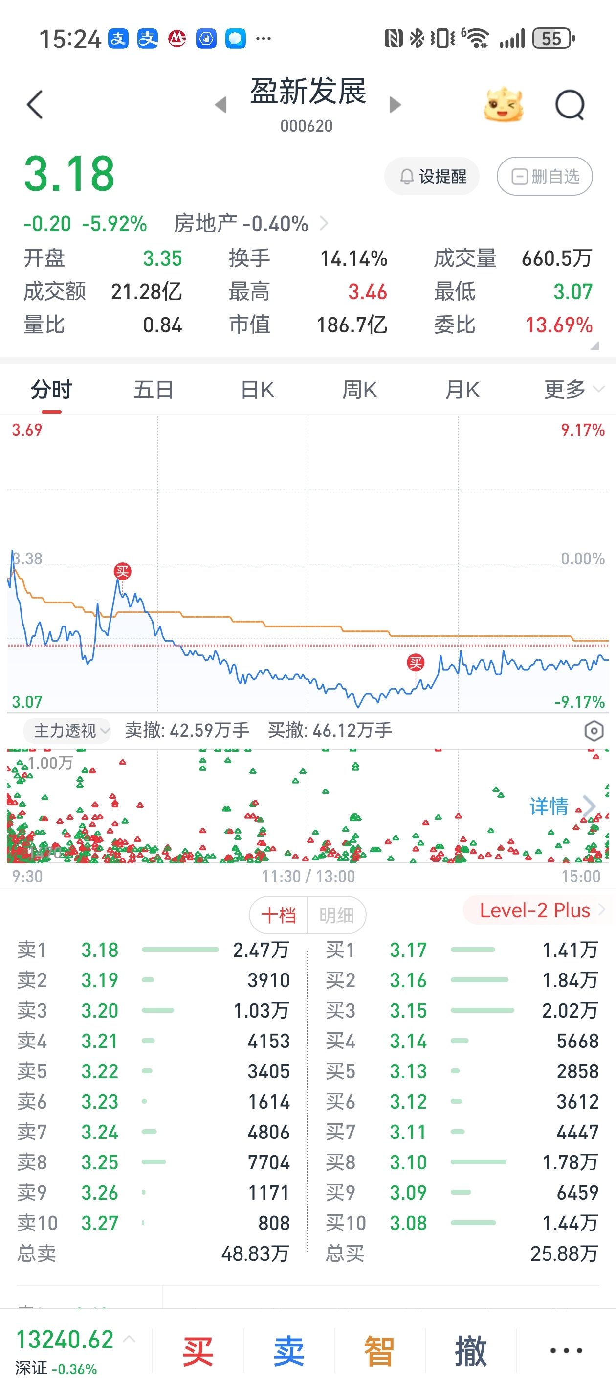 $盈新发展(SZ000620)$ 早上买在了山顶上,下午把科翔股份卖了补了你,希望明天别让我失望