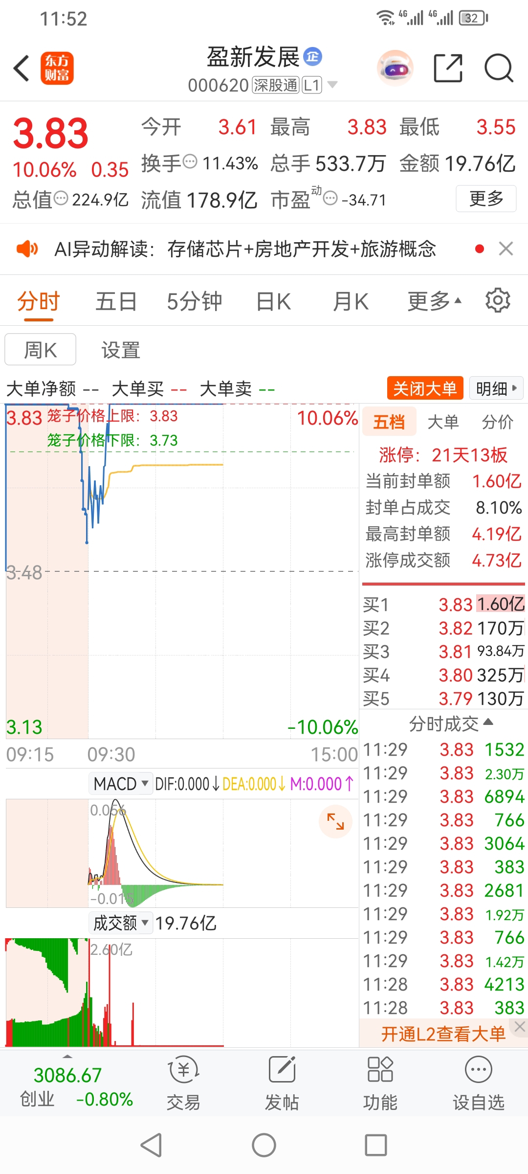 方军今天操盘盈信发展,放量涨停板。