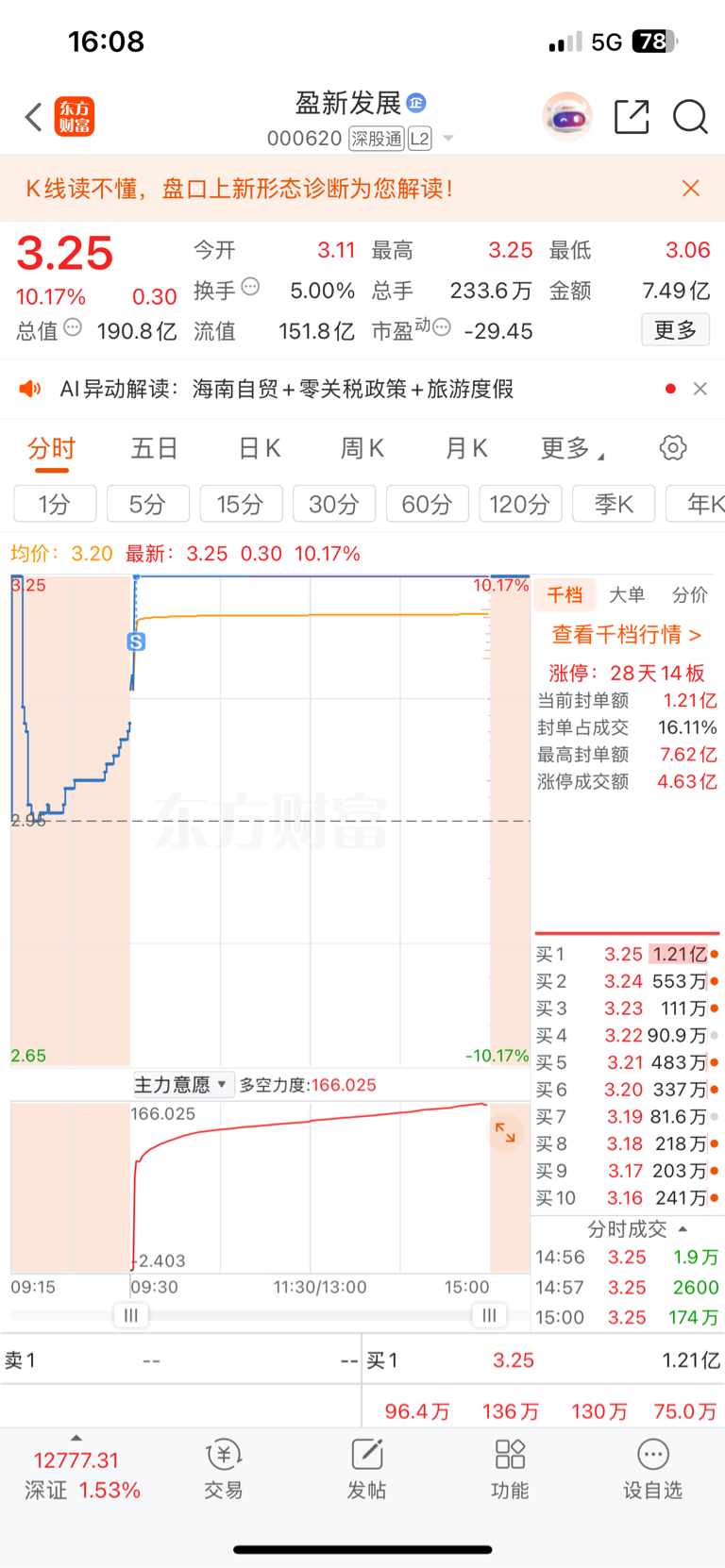 $盈新发展(SZ000620)$ 今天涨停就走了,这种秒板的通常会打开,小新竟然封得死死的,很可能明天继续高开封板。祝没走的继续发财。