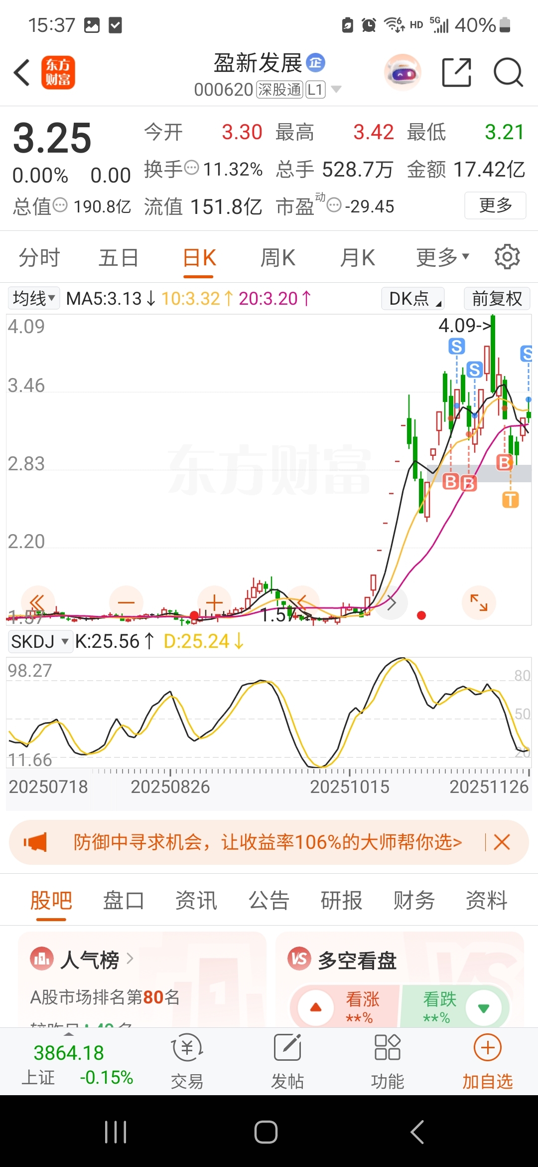 $盈新发展(SZ000620)$ 平盘收,还算比较强吧