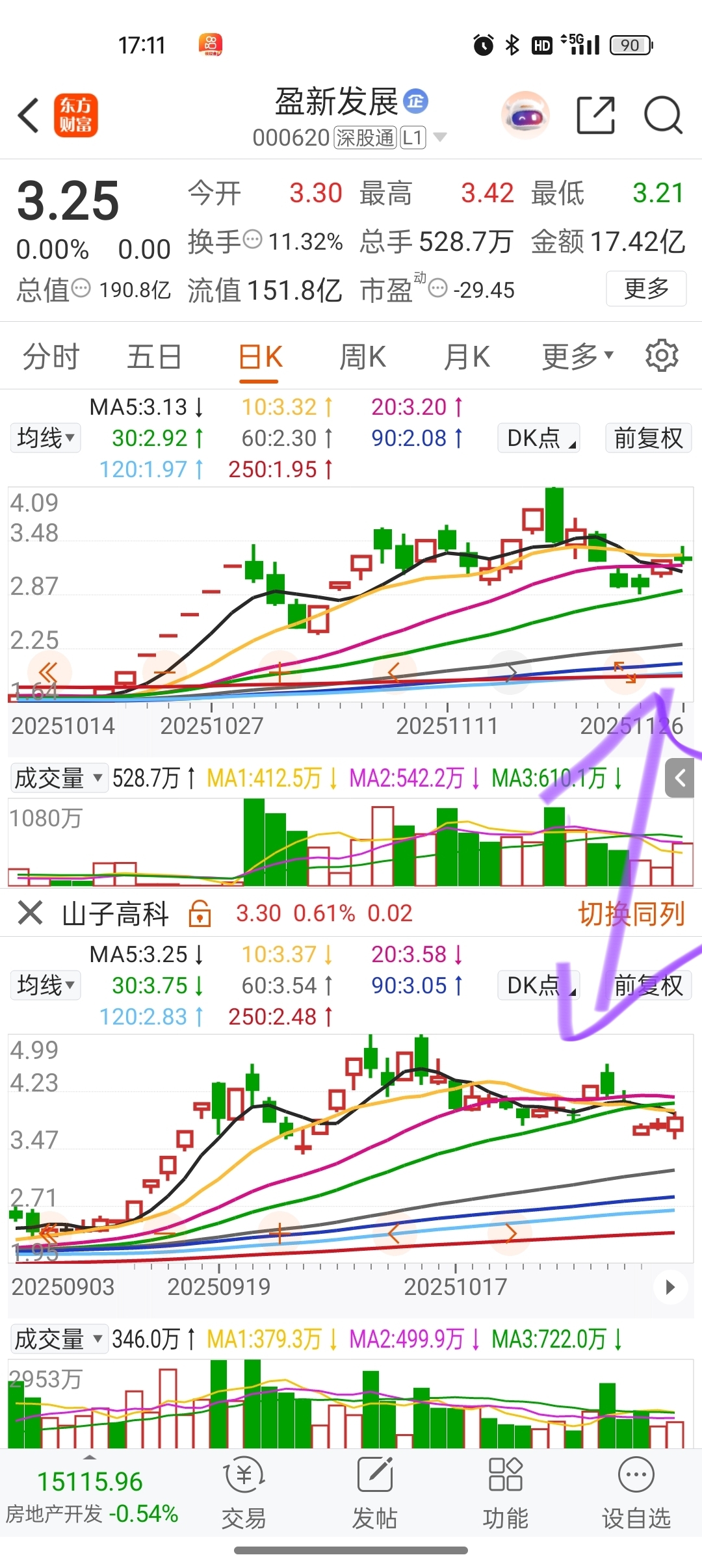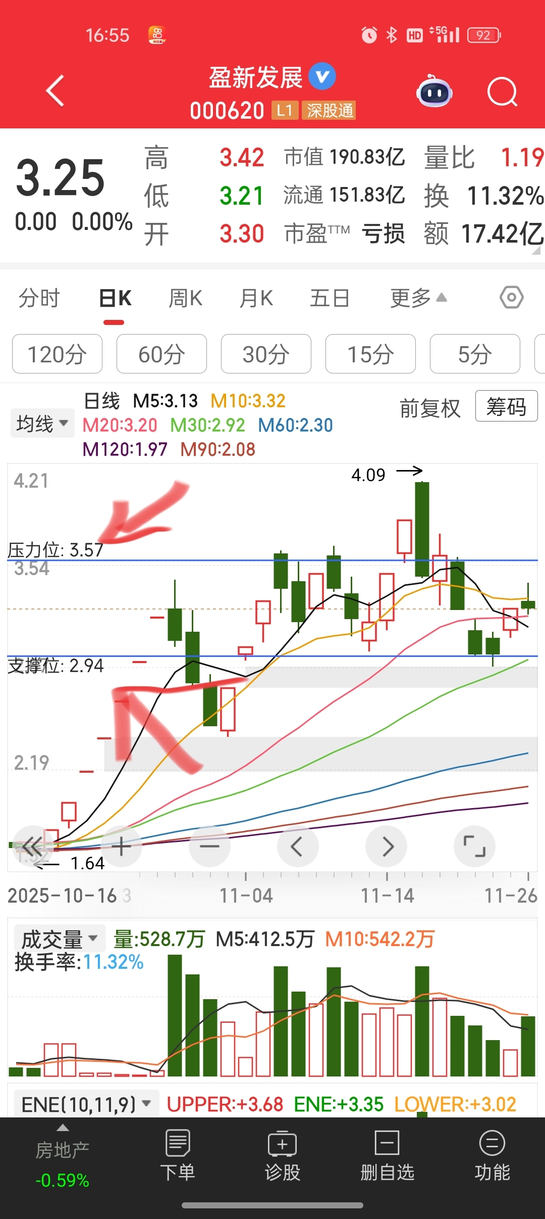 $盈新发展(SZ000620)$ 还是那句话,盈新走势看山子,山子走势看恒宝。我是昨天卖飞了盈新今天又傻了吧唧追高进的,贪心想再吃个涨停。根据今天盘面,盈新开始走弱啦,大概率明天下跌,明日以卖出为主。鄙人不才,全仓买入,杠杆拉满,当前仓位100%,成本3.5。附图是我画的线,请大家点评,共同提高水平