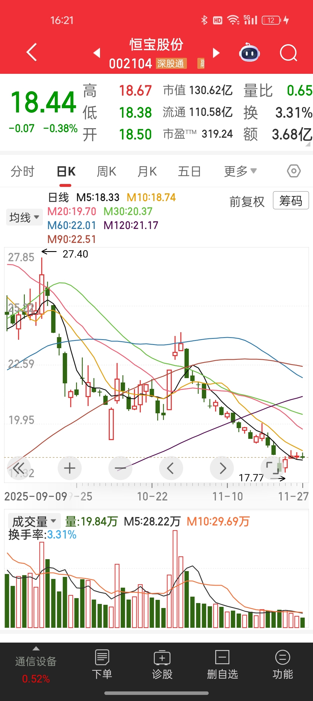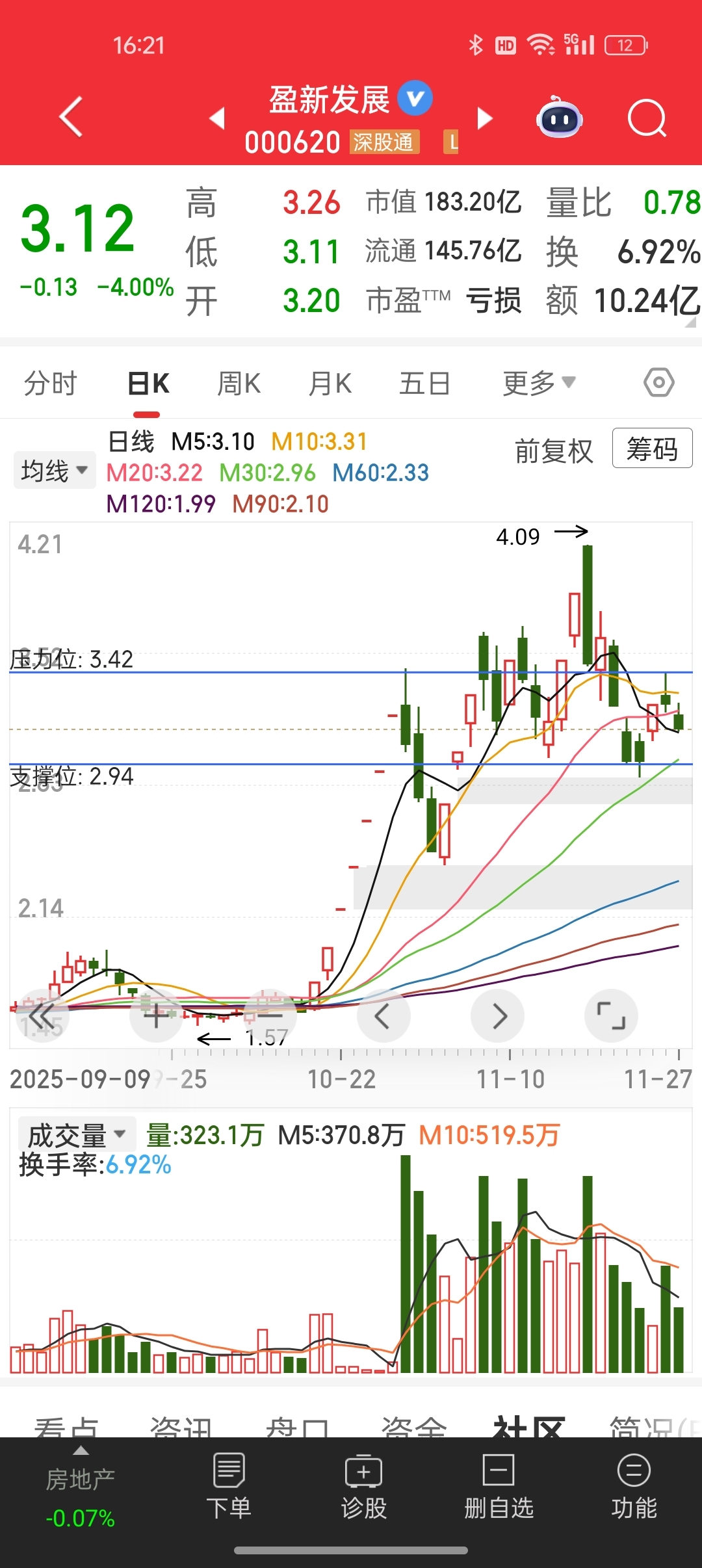 $盈新发展(SZ000620)$ 还是那句话,盈新走势看山子,山子走势看恒宝。按山子高科的剧本,盈新下一目标应该考验一下30日均线的支撑力度。熊市不言底,每一个底部或许就是半山腰,鄙人不才,割肉跑了,过两天或者明天回来,看情况