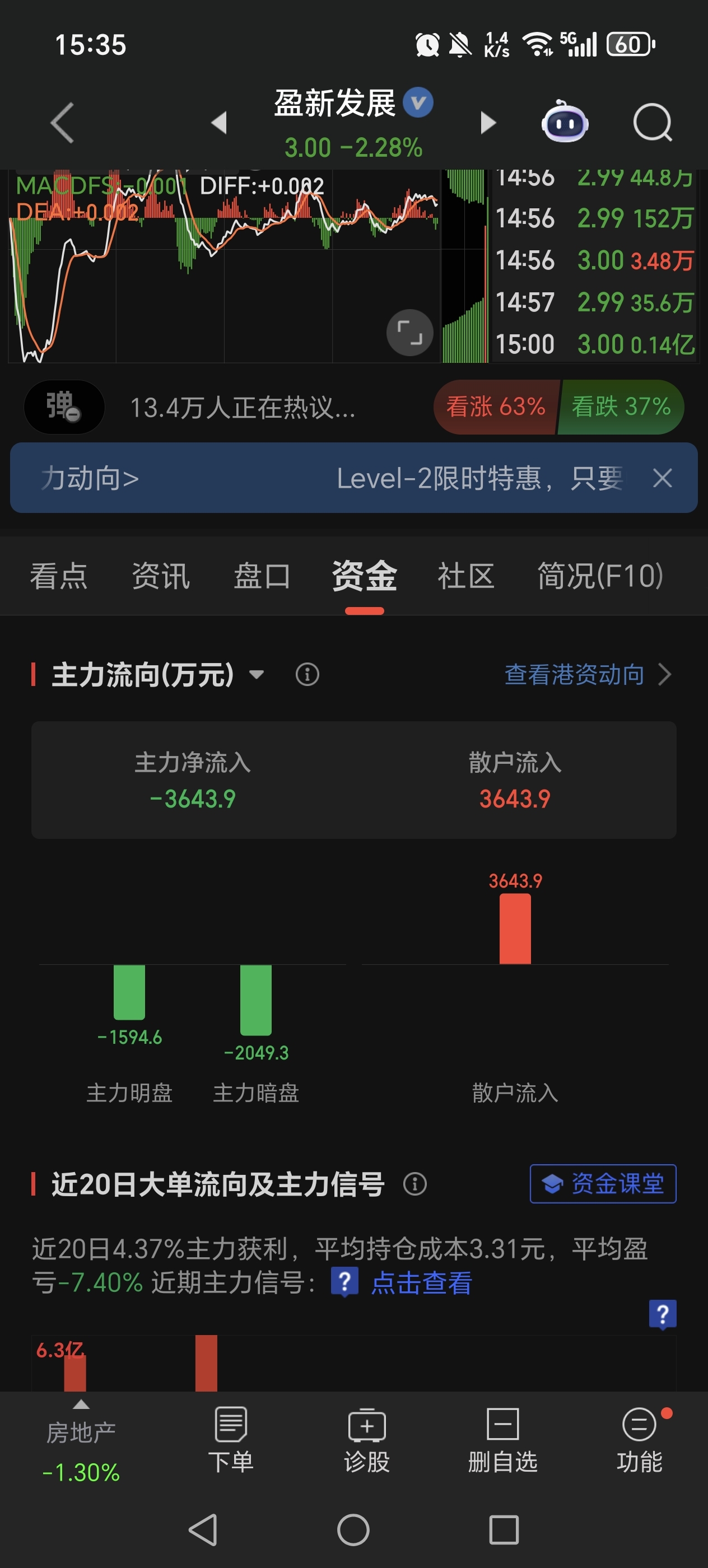 $盈新发展(SZ000620)$ 今天主力跑了三千万