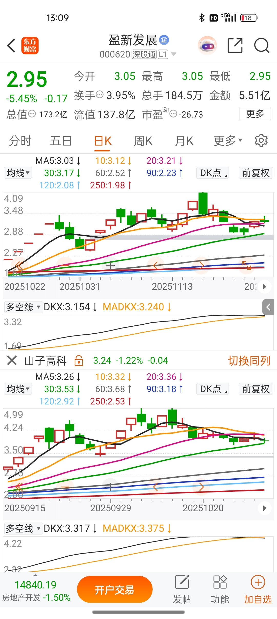 $盈新发展(SZ000620)$ 还是那句话,盈新走势看山子,山子走势看恒宝。盈新用的是山子的剧本,二者走势不要说很像,简直一模一样,盈新20日均线的支撑力度还不如山子