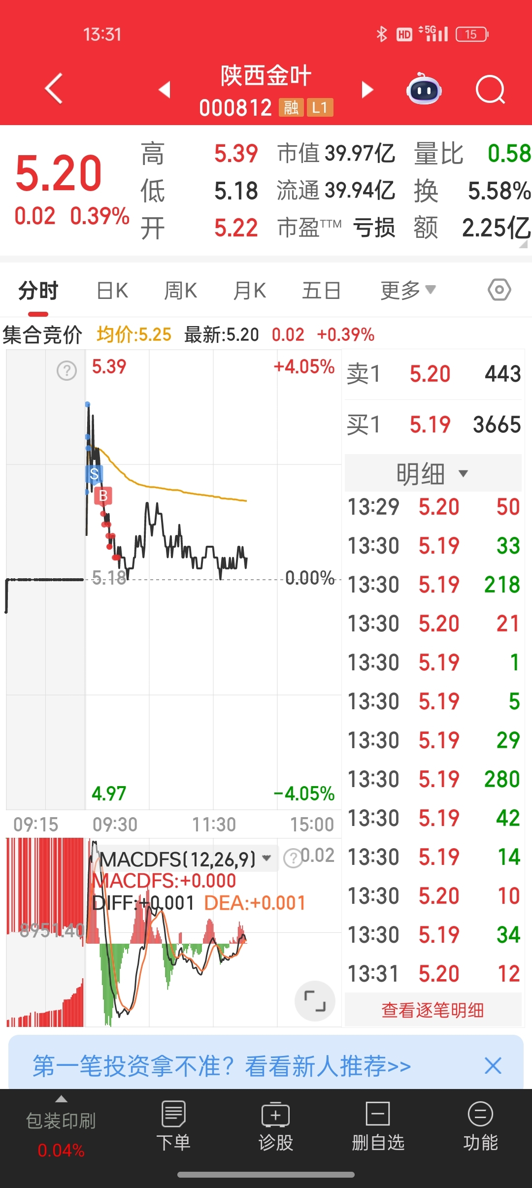 $盈新发展(SZ000620)$ $陕西金叶(SZ000812)$ 曾经,盈新也是我的梦中情股,如今,我买入金叶,我在金叶躲暴跌。鄙人不才,全仓买入,杠杆拉满。成本5.212,仓位100%。今日基操已完成,晒图如下