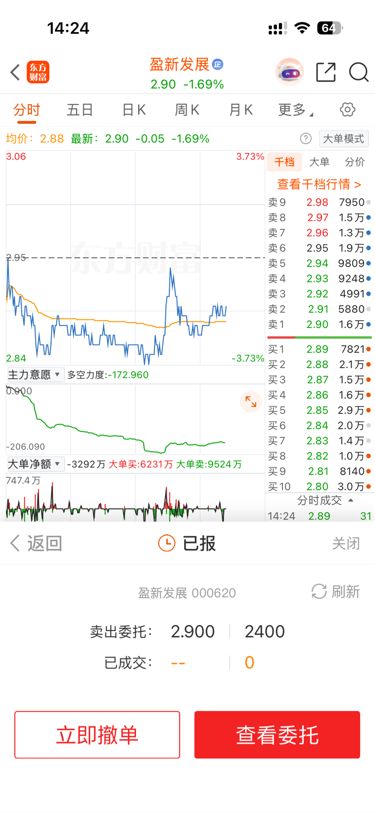 $盈新发展(SZ000620)$ 挂2.9清仓卖了,垃圾,再也不碰你了,外面一片后,耽误老子赚钱