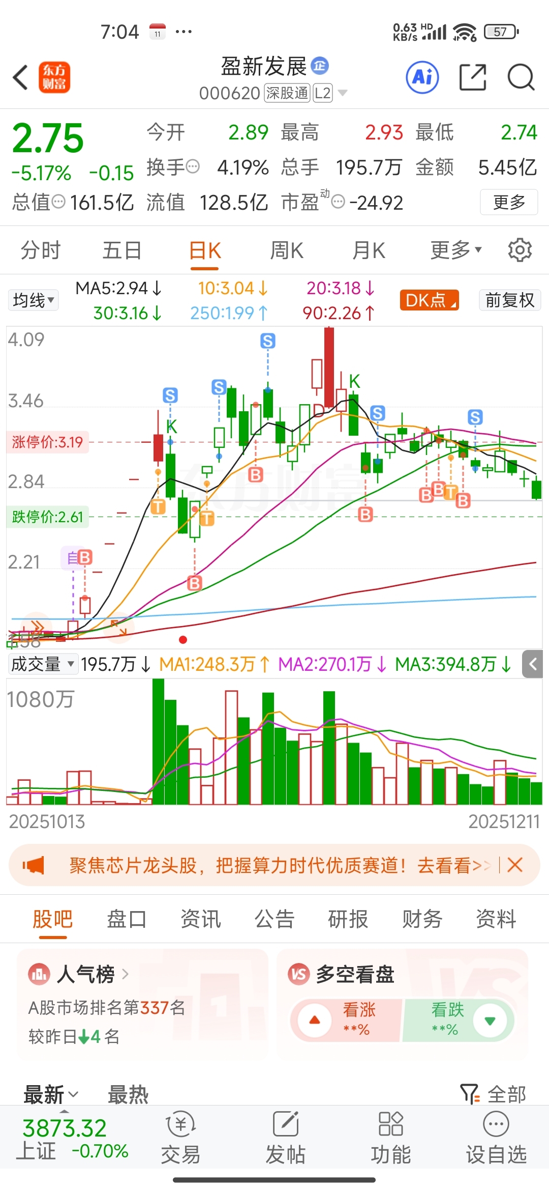 $盈新发展(SZ000620)$ 五进五出!前面四次获利,第五次做了几天T发现不对劲,果断止损离场。不管收购长兴是否成功?我是不想在里面煎熬了。