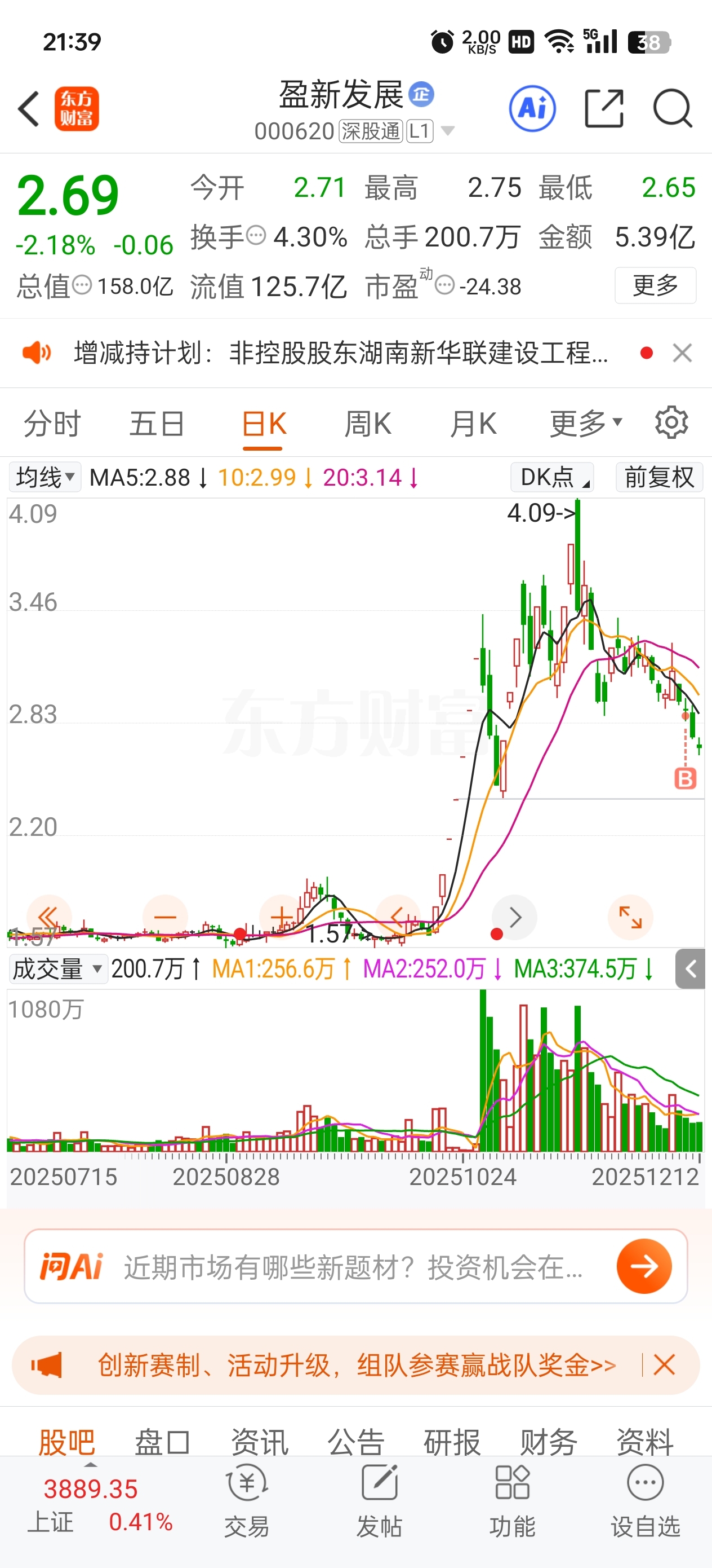 $盈新发展(SZ000620)$ 进来就被套78个点好烦恼,周一要不要止损