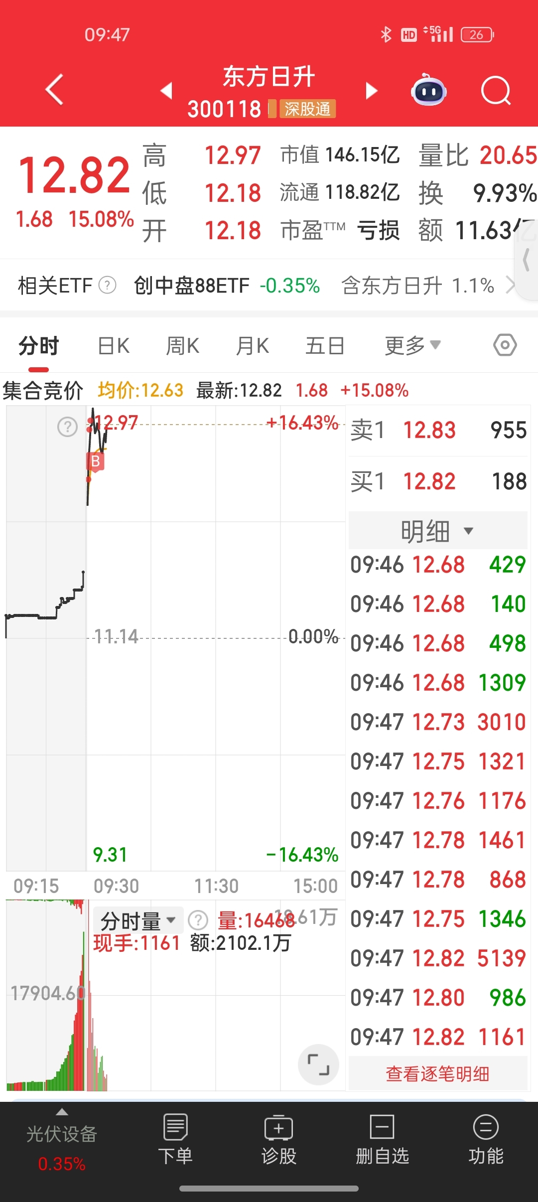 东方日升,买在盈新启动前。鄙人不才,全仓买入,杠杆拉满。成本12.72,仓位10