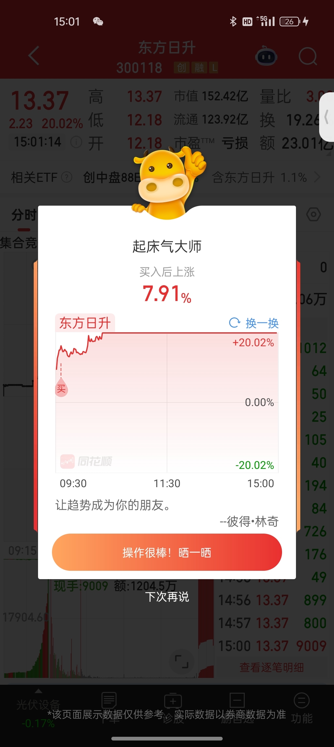$盈新发展(SZ000620)$ 现在,如果不是买入后就涨停板,如果不是20cm大长腿,如果不是连续涨停板,如果不是一字板那种,如果不是全仓这一只,都不好意思拿出来晒,哈哈哈,今天果断入了东方日升,这得需要多大的勇气战胜贪婪和恐惧啊。接着唱歌接着舞吧。鄙人不才,全仓买入,杠杆拉满,成本12.72,仓位100%。今日基操已完成,晒图如下