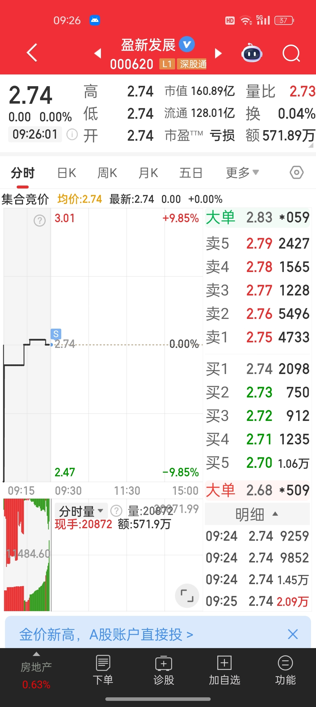 $盈新发展(SZ000620)$ 死道友不死贫道,集合竞价把我吓跑了,重磅利好不起作用,,已清仓,鄙人踏空了