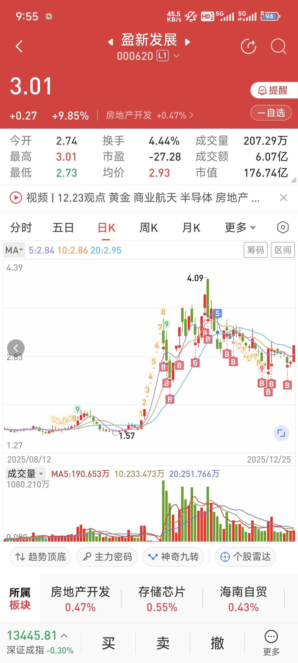 $盈新发展(SZ000620)$ 只买不卖,等你跨5奔7到10,我就走了。