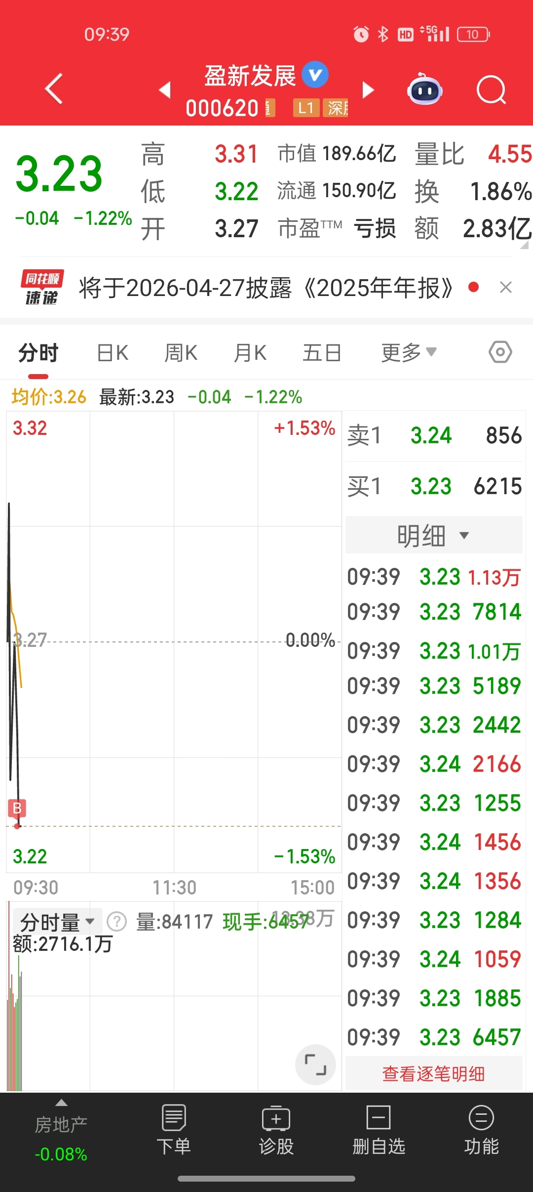 $盈新发展(SZ000620)$ 提前挂的3.23终于成交啦,鄙人不才,全仓买入,杠杆拉满,成本3.23,仓位100%,今日基操已完成晒图如下