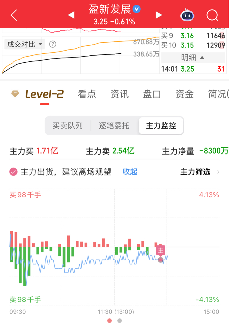 $盈新发展(SZ000620)$ 主力持续出货中