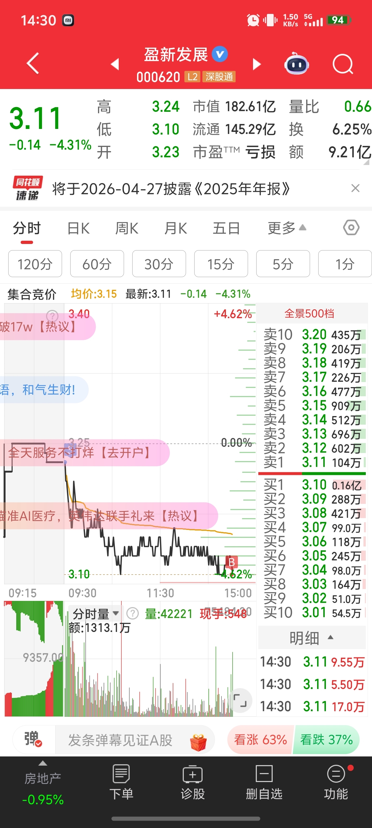 $盈新发展(SZ000620)$ 就买了10手咋办,在线等挺急的,今天不敢追