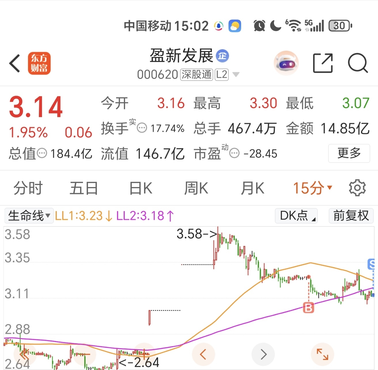 $盈新发展(SZ000620)$ 买早了一天,不然今天发财,中午看了看手机16分钟就暴跌下来,亏钱也走了,不陪你明天发癫!