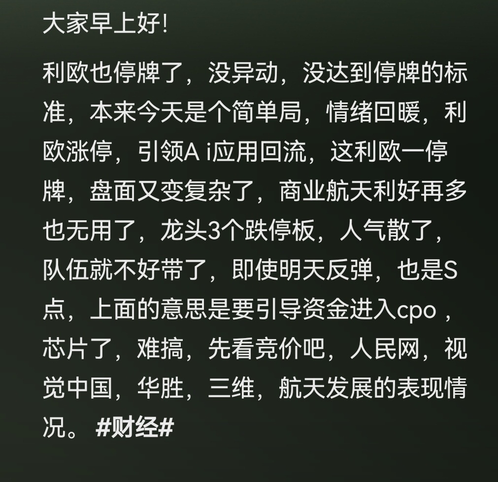 郑重声明:用户在财富号/股吧/博客等社区发表的所有信息(包括但不限于文字、视频、音频、数据及图表)仅代表个人观点,与本网站立场无关,不对您构成任何投资建议,据此操作风险自担。请勿相信代客理财、免费荐股和炒股培训等宣传内容,远离非法证券活动。请勿添加发言用户的手机号码、公众号、微博、微信及QQ等信息,谨防上当受骗!