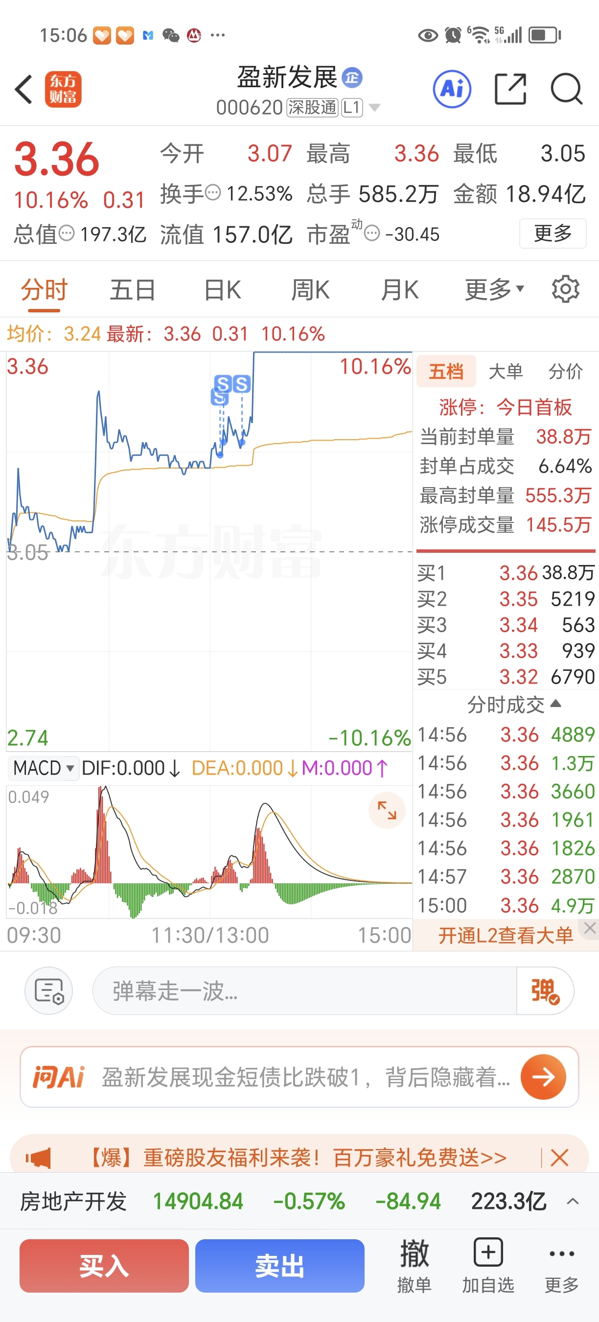 $盈新发展(SZ000620)$ 今天计划格涨停板 下午还是 封涨停 还是做错了卖飞了 该死 哎